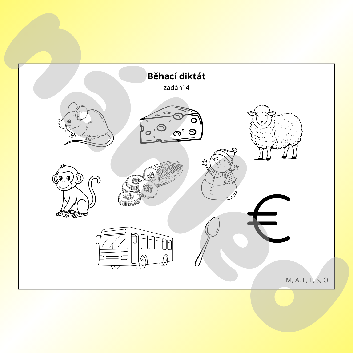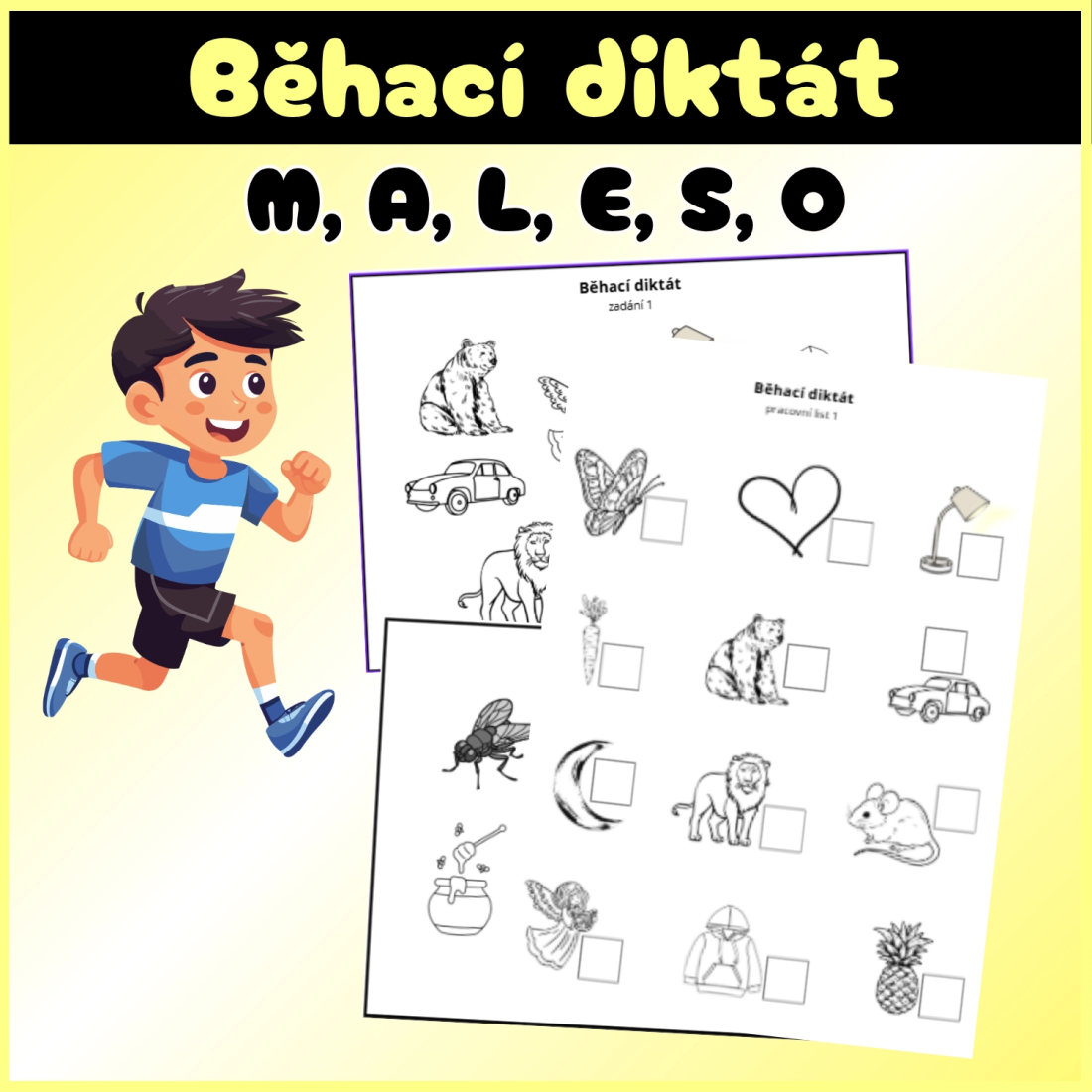 Materiál obsahuje 4 běhací diktáty určené k procvičování prvních písmen, se kterými se děti v 1. třídě seznamují – M, A, L, E, S, O.