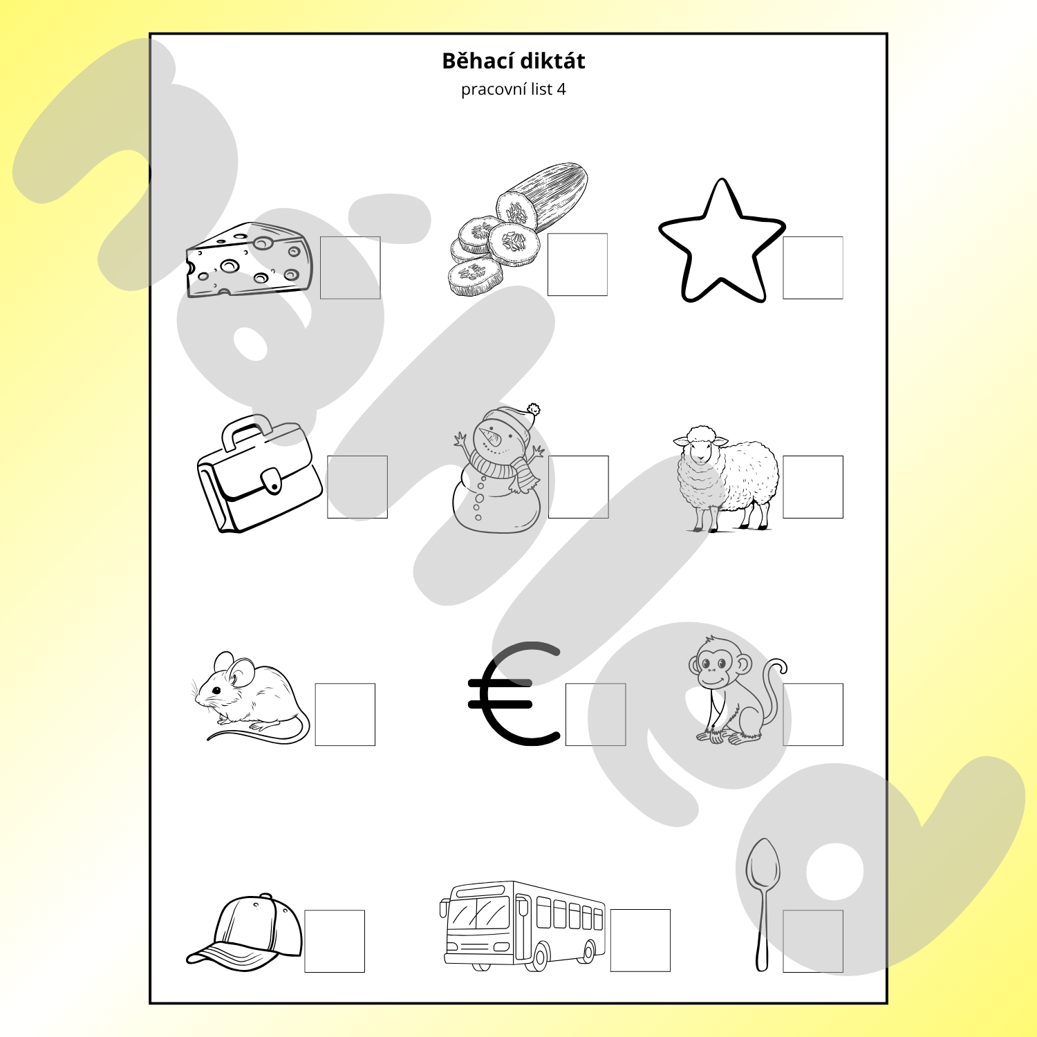Každý diktát obsahuje zadání s obrázky a pracovní list pro zápis písmen.