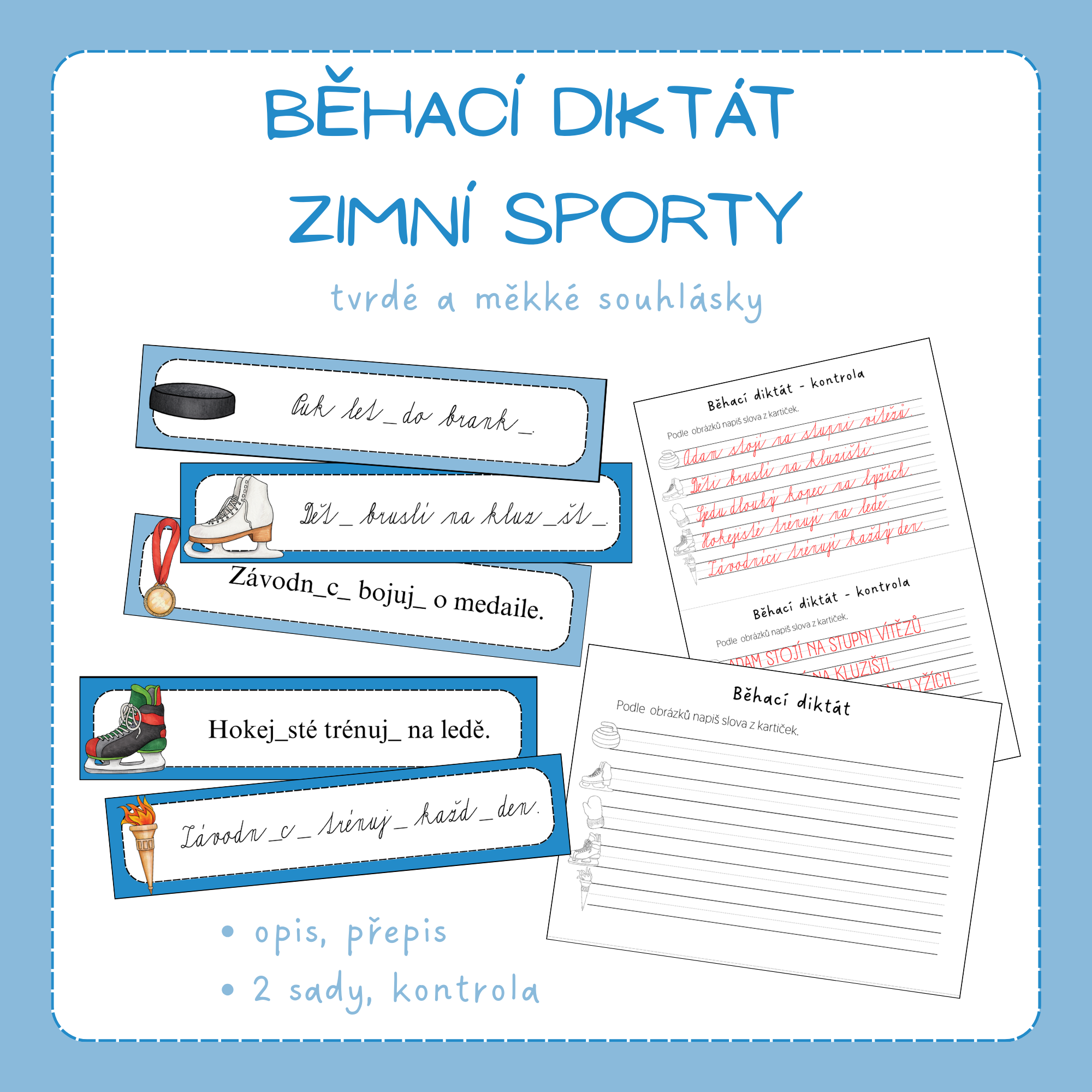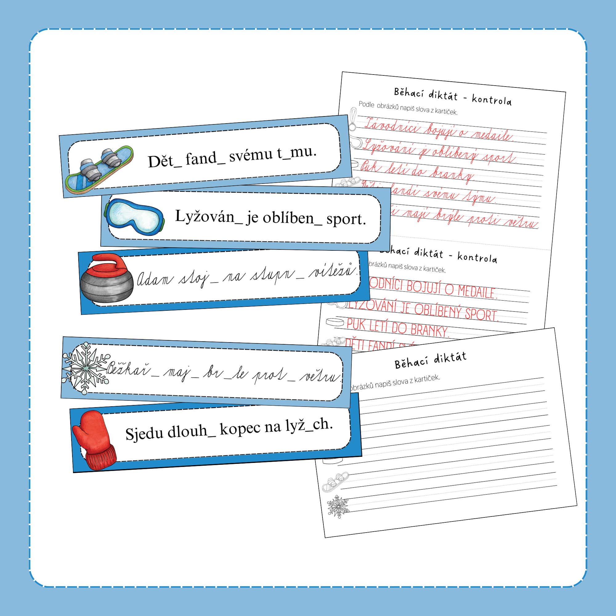 Běhací diktát obsahuje 2 sady, každá sada má 5 vět. Věty jsou zaměřené na procvičování tvrdých a měkkých souhlásek v tematice zimních sportů.