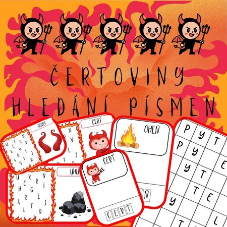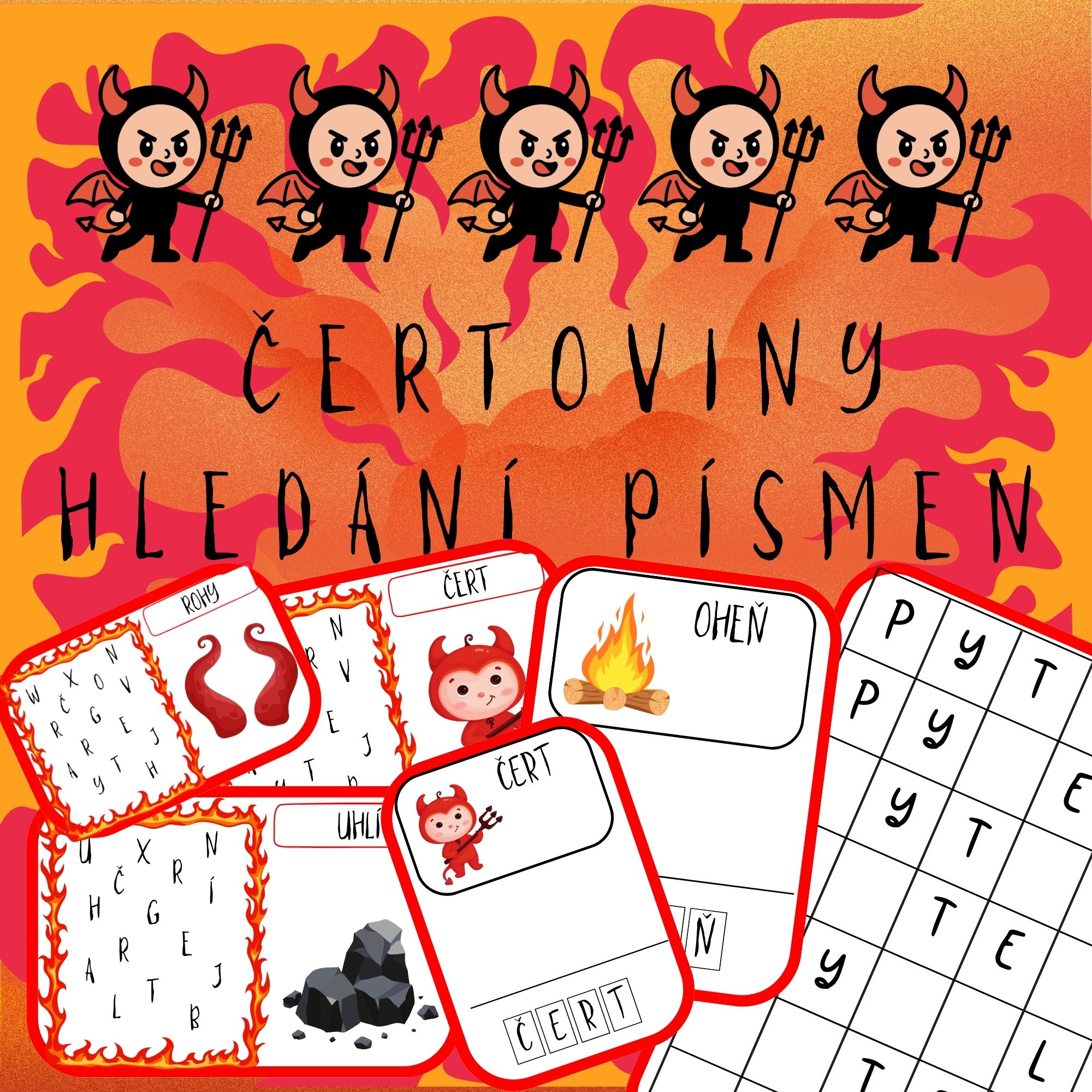 Hledání písmen tematicky zaměřené kartičky. Na každé kartičce je v horní části napsáno slovo s obrázkem. Děti mají za úkol najít a zakroužkovat všechna písmena, která ve slově jsou, mezi písmenky na levé části kartičky. K označování písmen využijte mazatelné fixy.