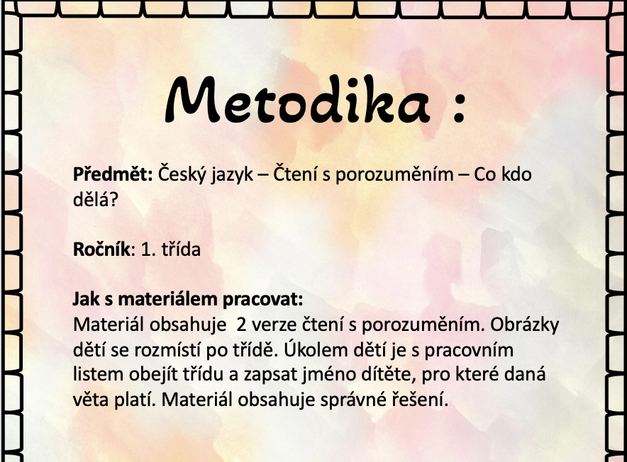 Materiál obsahuje 2 verze čtení s porozuměním. Obrázky dětí se rozmístí po třídě. Úkolem dětí je s pracovním listem obejít třídu a zapsat jméno dítěte, pro které daná věta platí. Materiál obsahuje správné řešení.