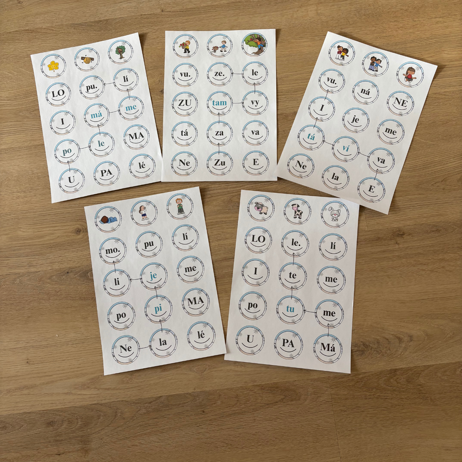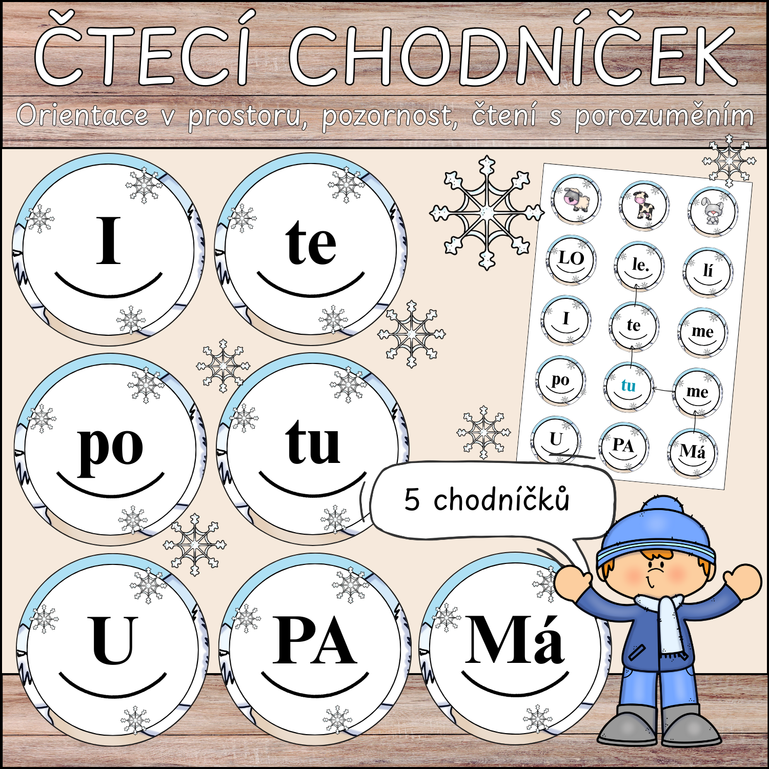 Materiál obsahuje pět čtecích chodníčků zaměřených na slabiky až po písmeno Z. Součástí každého chodníčku jsou čtecí mapy určené k orientaci a kruhy se slabikami, které žáci skládají do slov a vět.