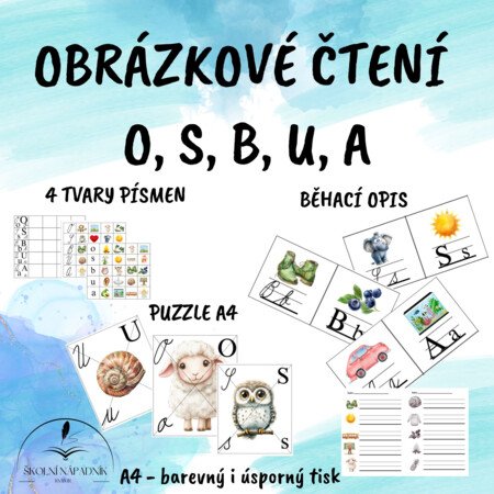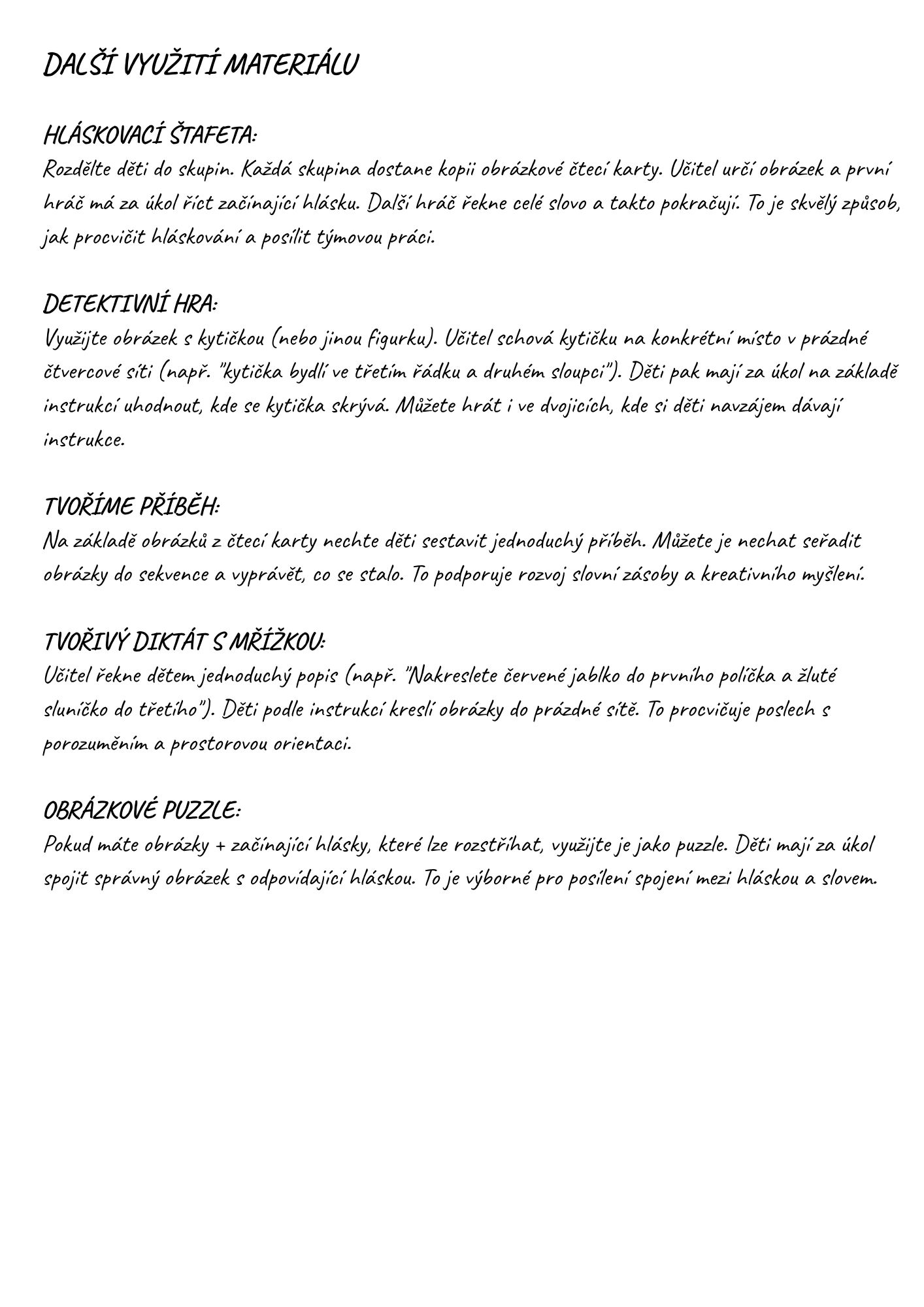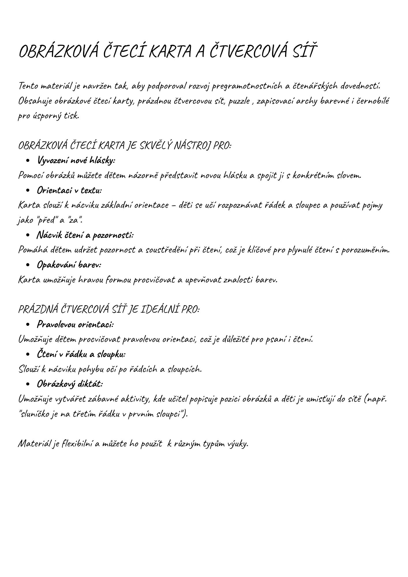 Obsahuje obrázkové čtecí karty, prázdnou čtvercovou sít, puzzle , běhací opis a zapisovací archy barevné i černobílé pro úsporný tisk, hru detektiv. a další.