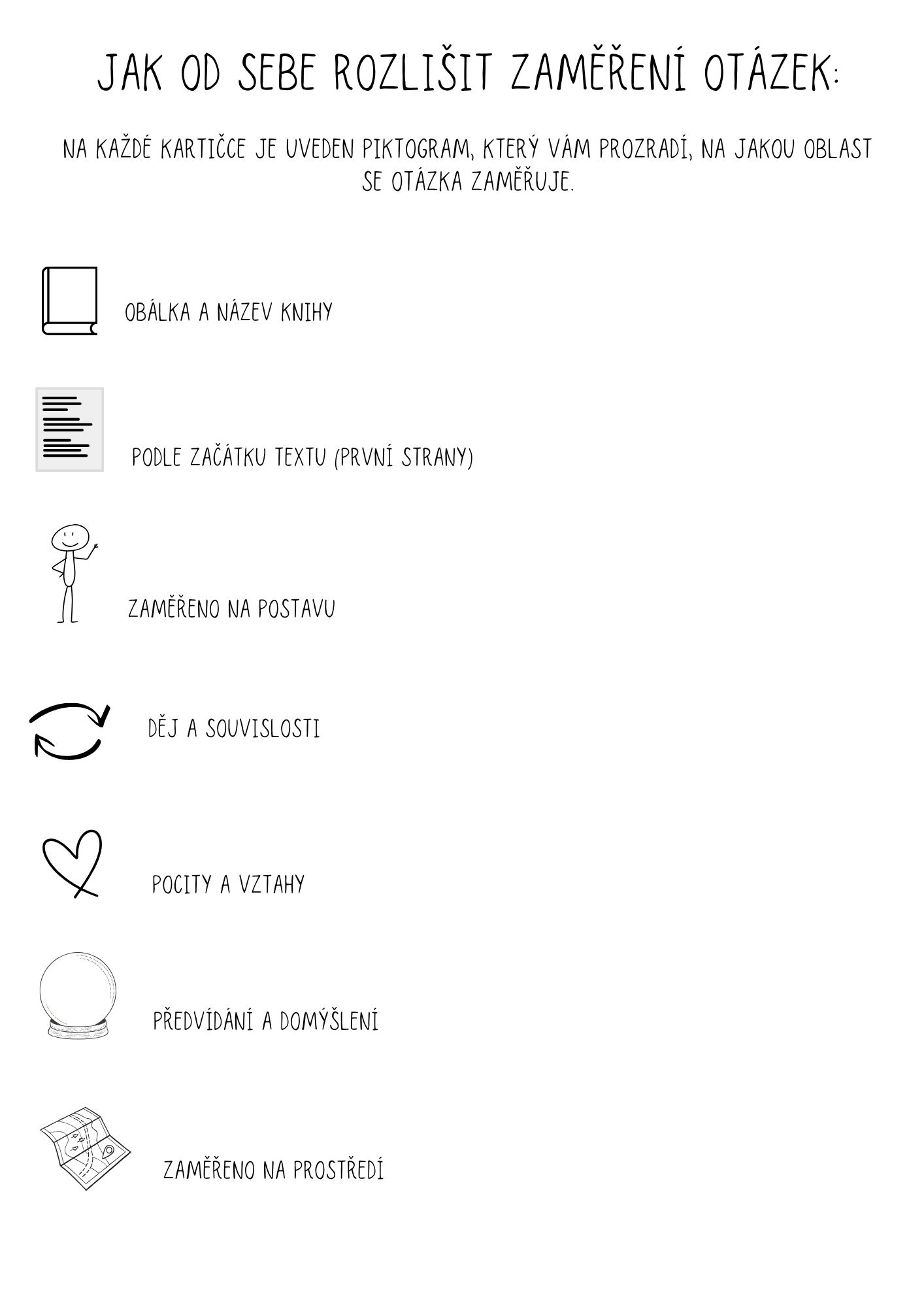 - Obsahují otázky rozdělené do několika oblastí – postavy, děj, prostředí, pocity, vztahy i předvídání.