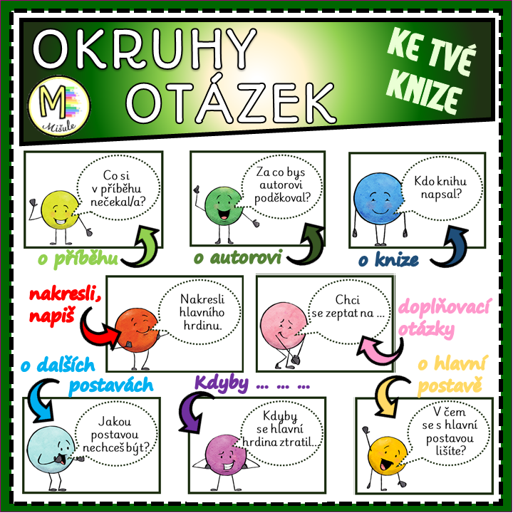 4. O příběhu (světle zelená)– děti se učí shrnout děj, pochopit souvislosti a hlavní myšlenku, jak by mohl příběh pokračovat,…