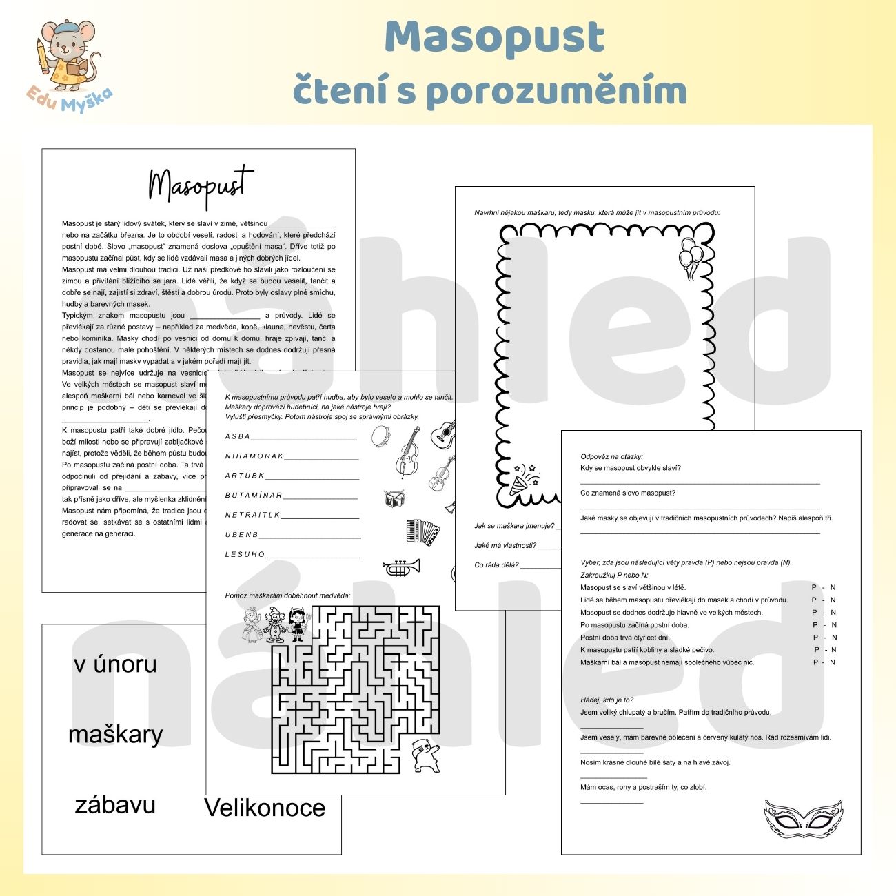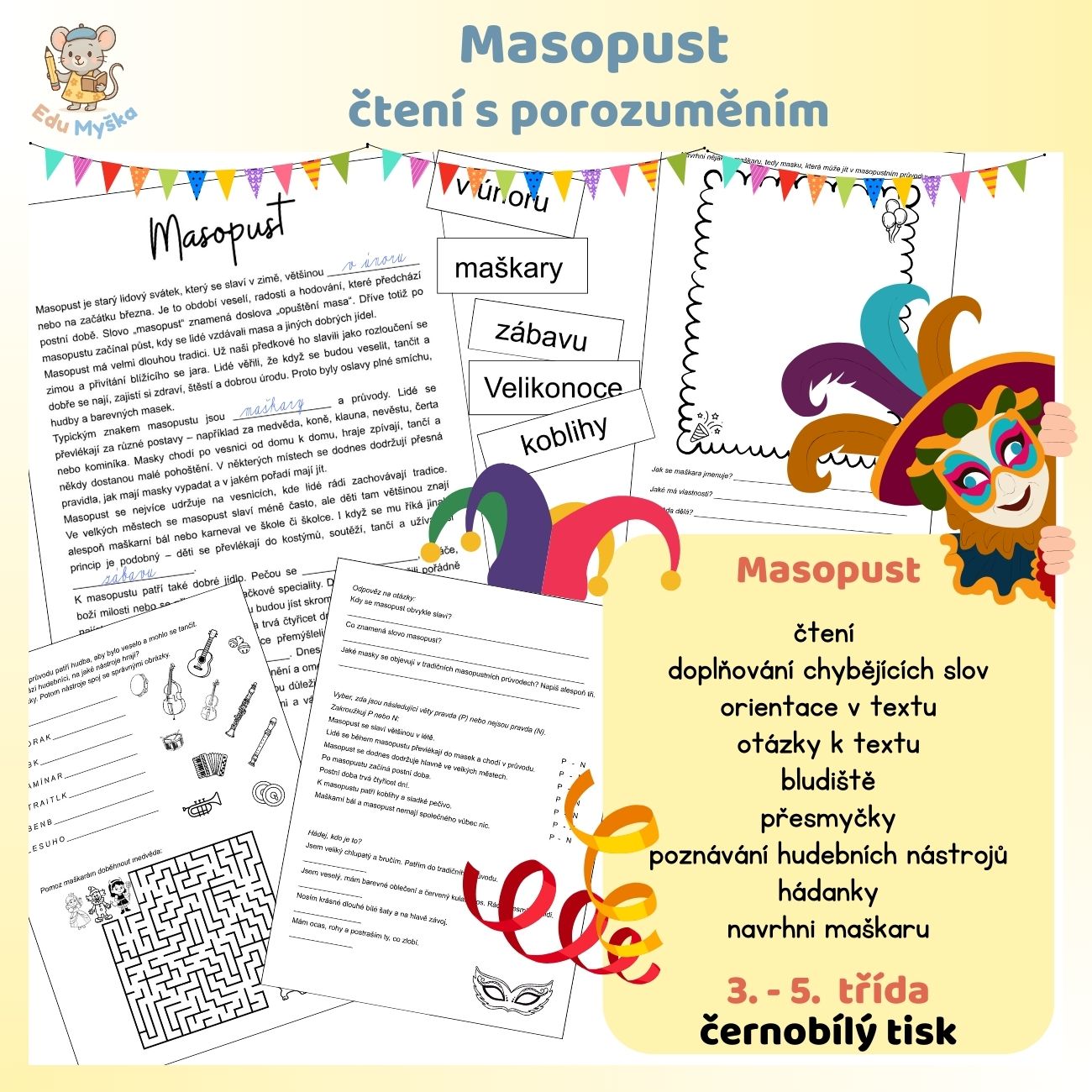 - Text o masopustu - v textu chybí 5 slov. Chybějící slova může vyučující rozmístit po třídě, žáci je hledají a pak podle smyslu dopisují do vět. Žáci mohou text dostat rozstříhaný po odstavcích a jejich úkolem je text správně seřadit a nalepit na papír ve správném pořadí.