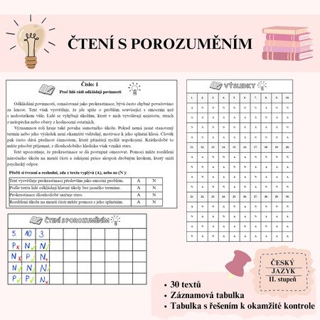 - Sada 30 textů – tematicky pestré, rozsahově vyrovnané texty vhodné pro žáky 2. stupně.