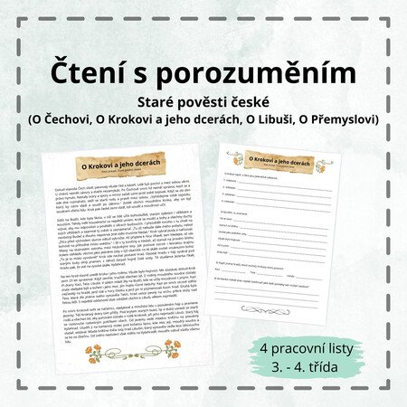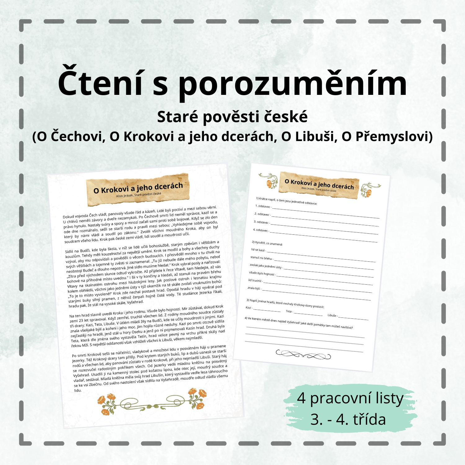 Materiál obsahuje celkem 4 zpracované pověsti. Jedná se o 4 oboustranné pracovní listy, kdy na jedné straně je pověst a na druhé úkoly vztahující se k textu. Na konci dokumentu naleznete řešení.