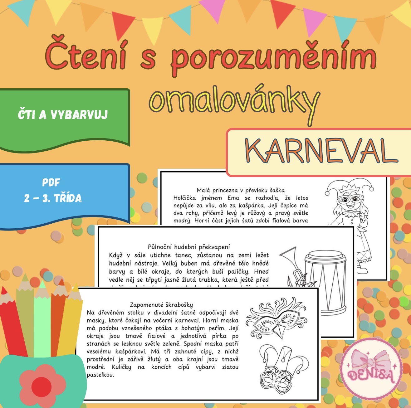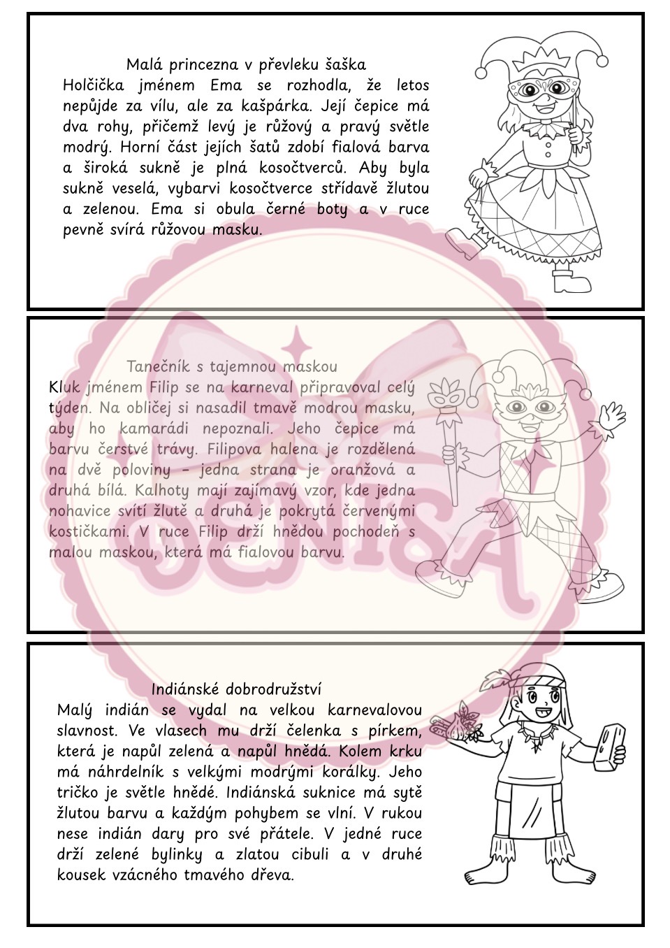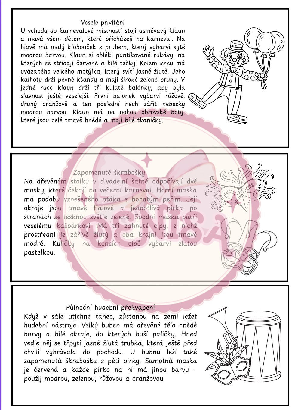 Soubor obsahuje celkem šest pracovních listů s karnevalovou tematikou. Děti se v nich seznámí s veselým klaunem u vchodu, princeznou v kostýmu šaška nebo zapomenutými maskami v divadelní šatně.