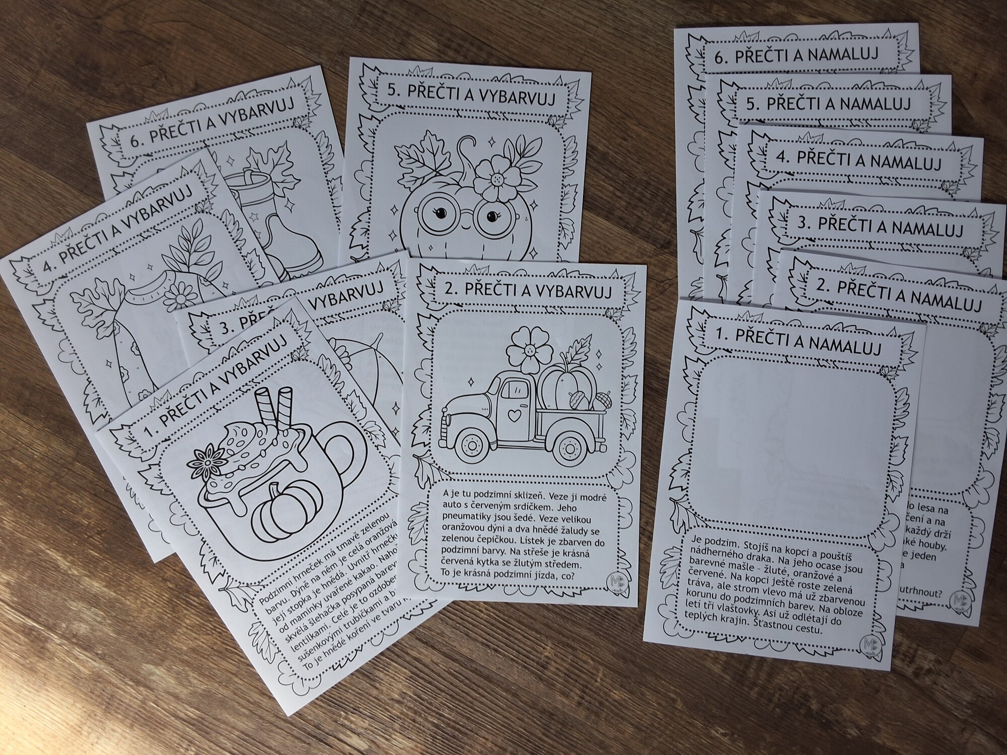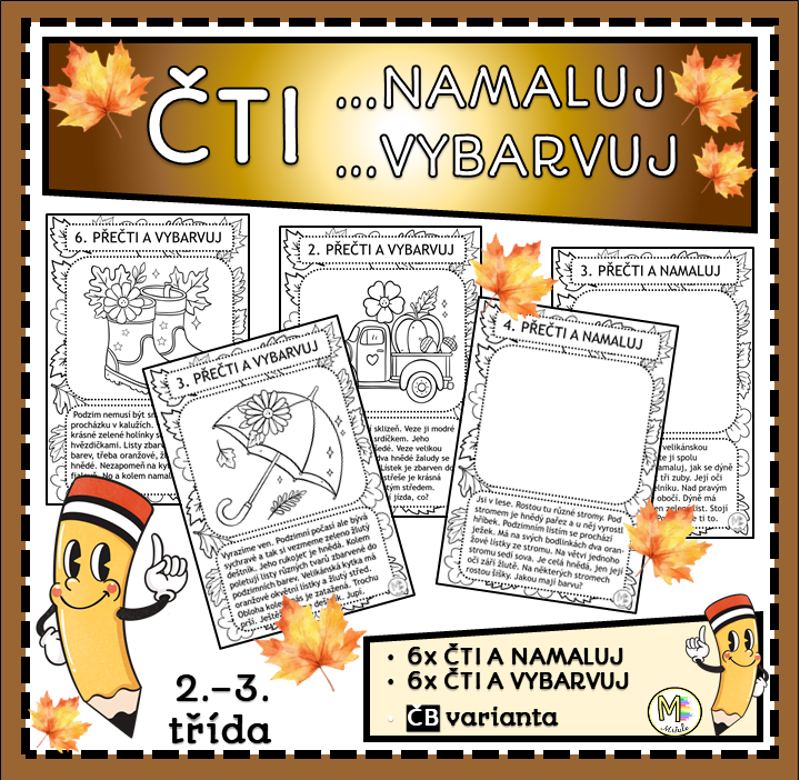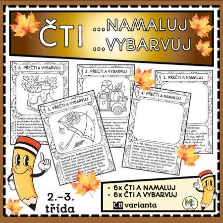 – 6 listů Čti a namaluj – žáci si přečtou krátký text, ve kterém najdou konkrétní instrukce. Podle nich dokreslují obrázek do prázdného rámečku. Úkolem je vystihnout prostředí, zachytit barvy, tvary a prvky popsané v textu. Tento typ aktivity rozvíjí nejen čtení s porozuměním, ale také představivost a schopnost převést textovou informaci do výtvarného zpracování.