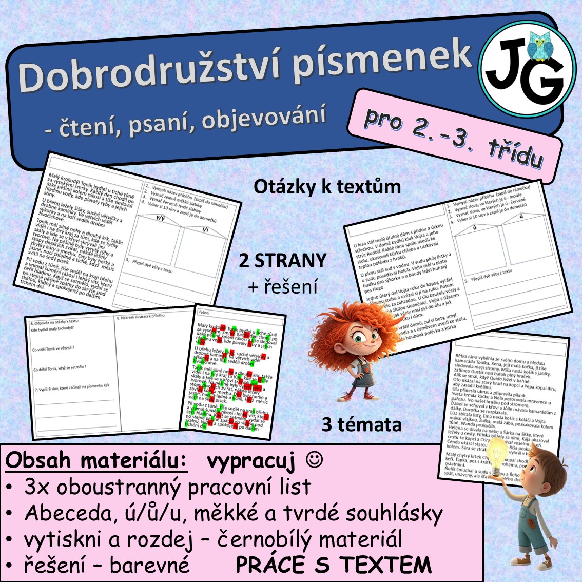 Dobrodružství písmenek: čtení, psaní a objevování je soubor pracovních listů určený pro děti druhé a třetí třídy, který kombinuje zábavu s procvičováním čtení, psaní a logického myšlení. Každý list obsahuje krátký příběh vhodný věkově pro děti a zaměřený na konkrétní jazykovou oblast. Některé příběhy procvičují celou abecedu, děti vyhledávají slova začínající na jednotlivá písmena a řadí je podle abecedy. Jiné příběhy se soustředí na slova obsahující ú, ů a u, nebo na procvičování tvrdých a měkkých souhlásek, aby si děti osvojily správnou výslovnost i pravopis.
