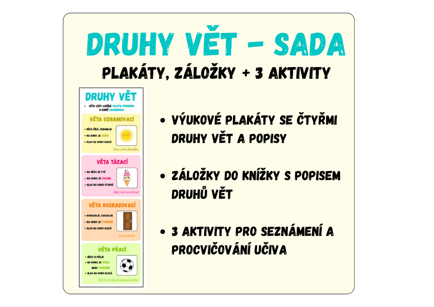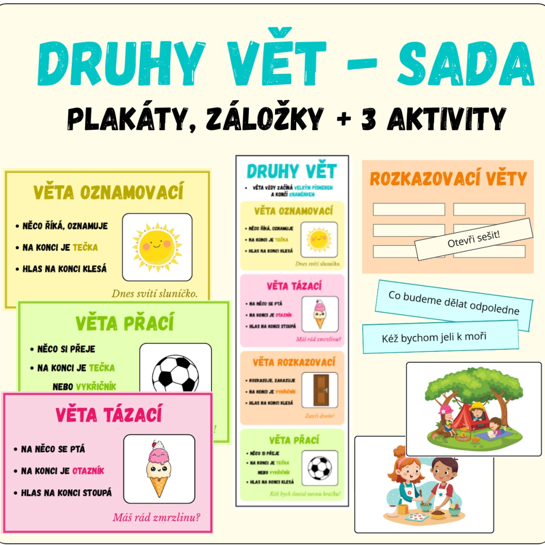 - výukové plakáty se čtyřmi druhy vět a popisy