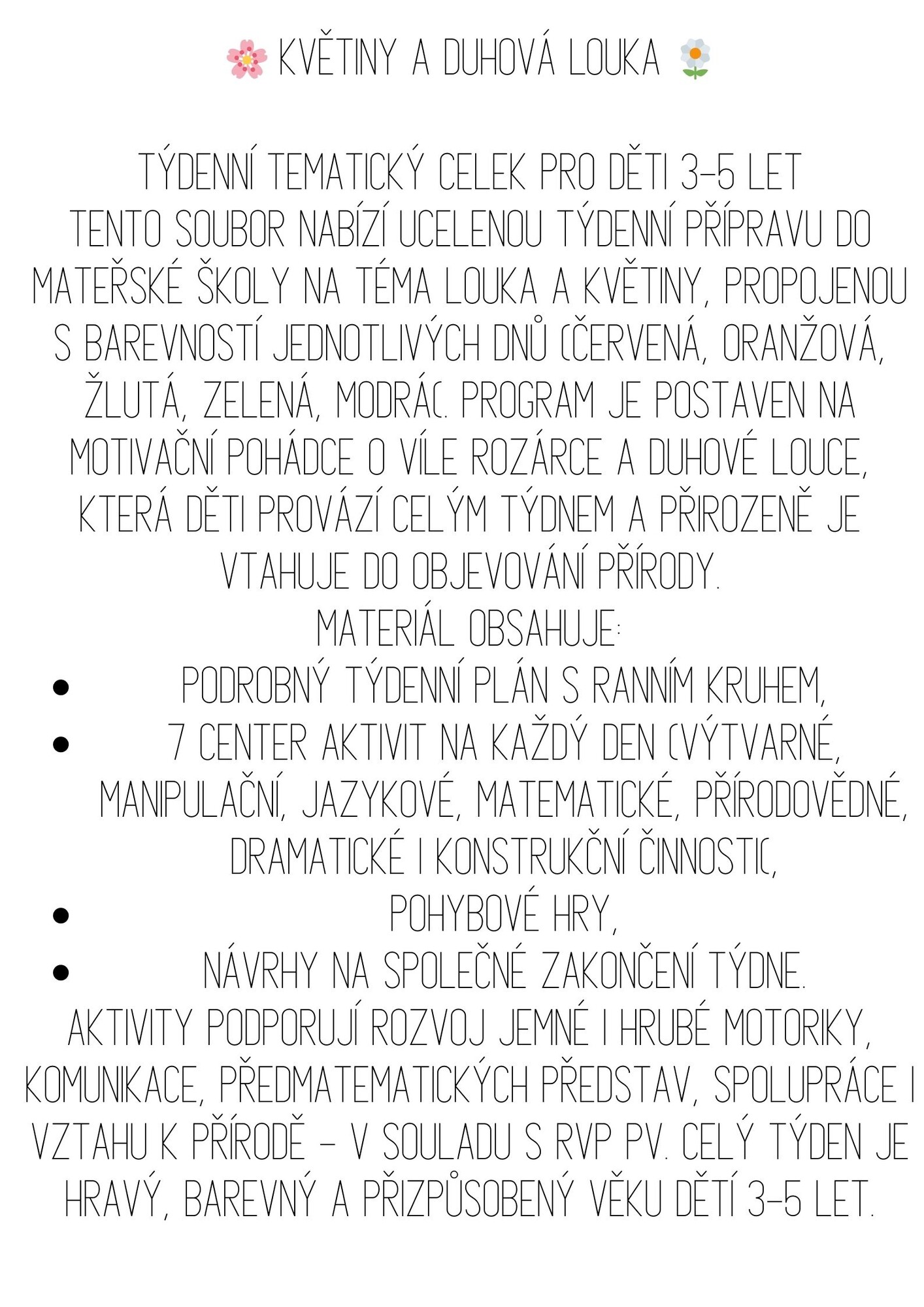 Tento soubor nabízí ucelenou týdenní přípravu do mateřské školy na téma Louka a květiny, propojenou s barevností jednotlivých dnů (červená, oranžová, žlutá, zelená, modrá). Program je postaven na motivační pohádce o víle Rozárce a Duhové louce, která děti provází celým týdnem a přirozeně je vtahuje do objevování přírody.