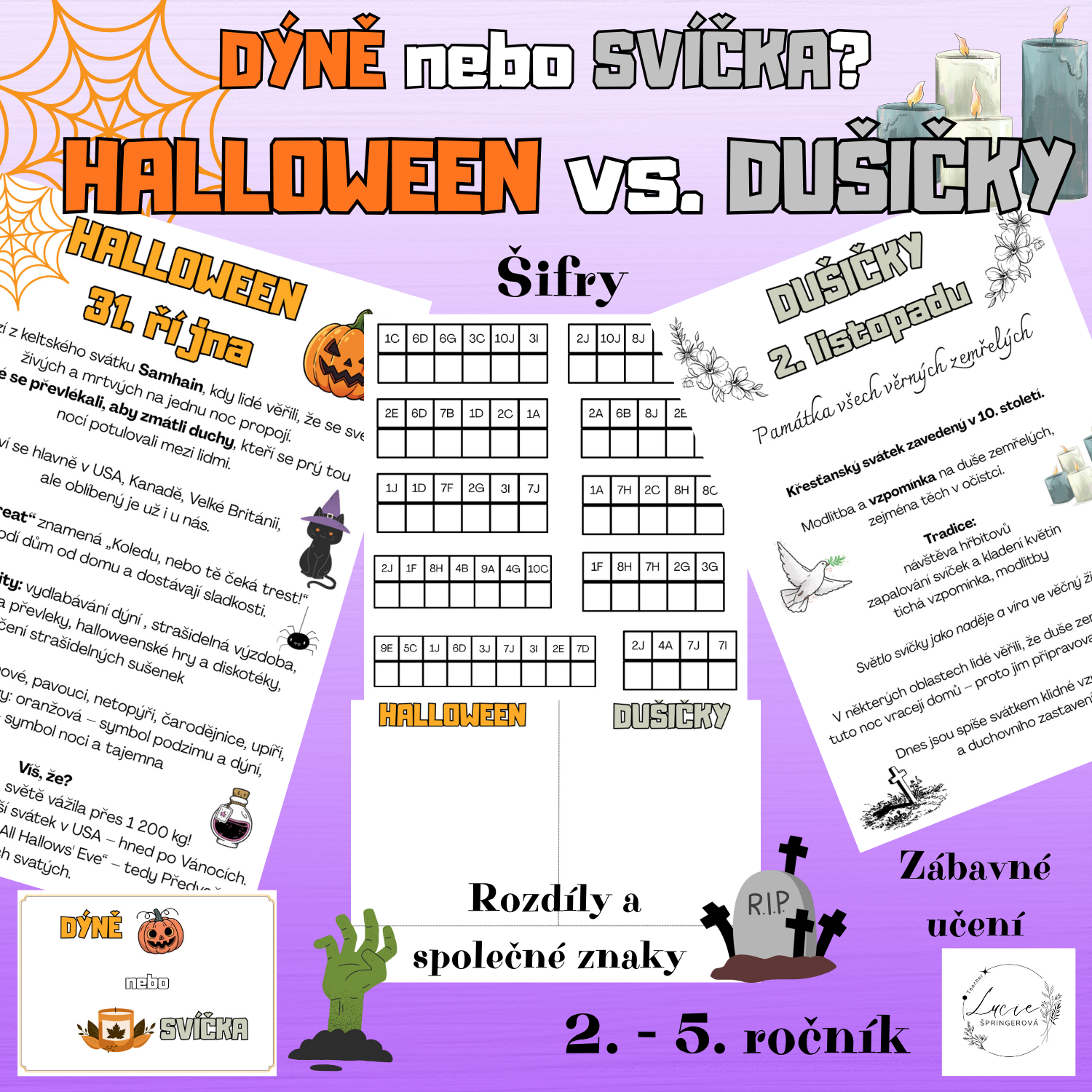 Rozdíly a společné znaky Halloweenu a Dušiček - zábavnou formou rozlušti šifru a přiřaď k danému svátku.