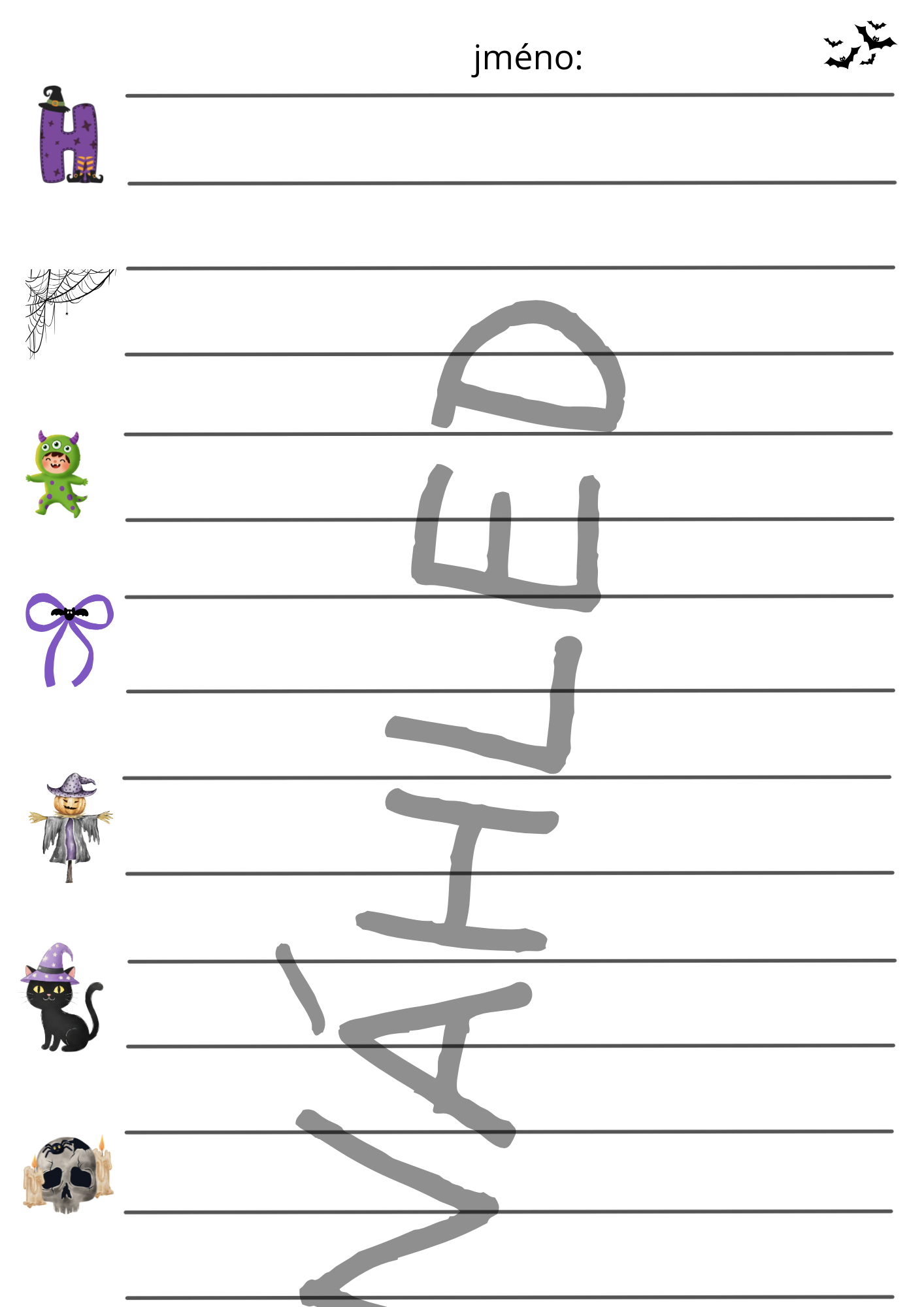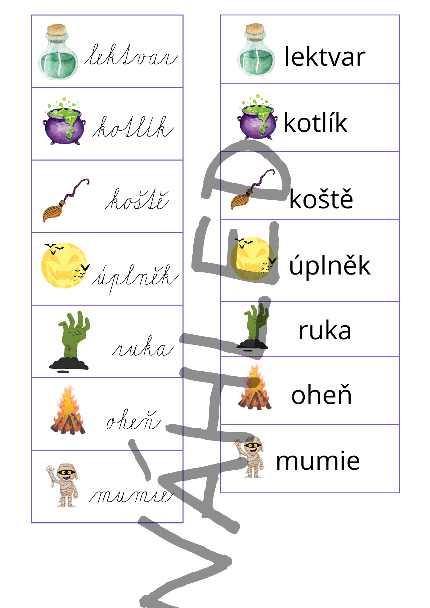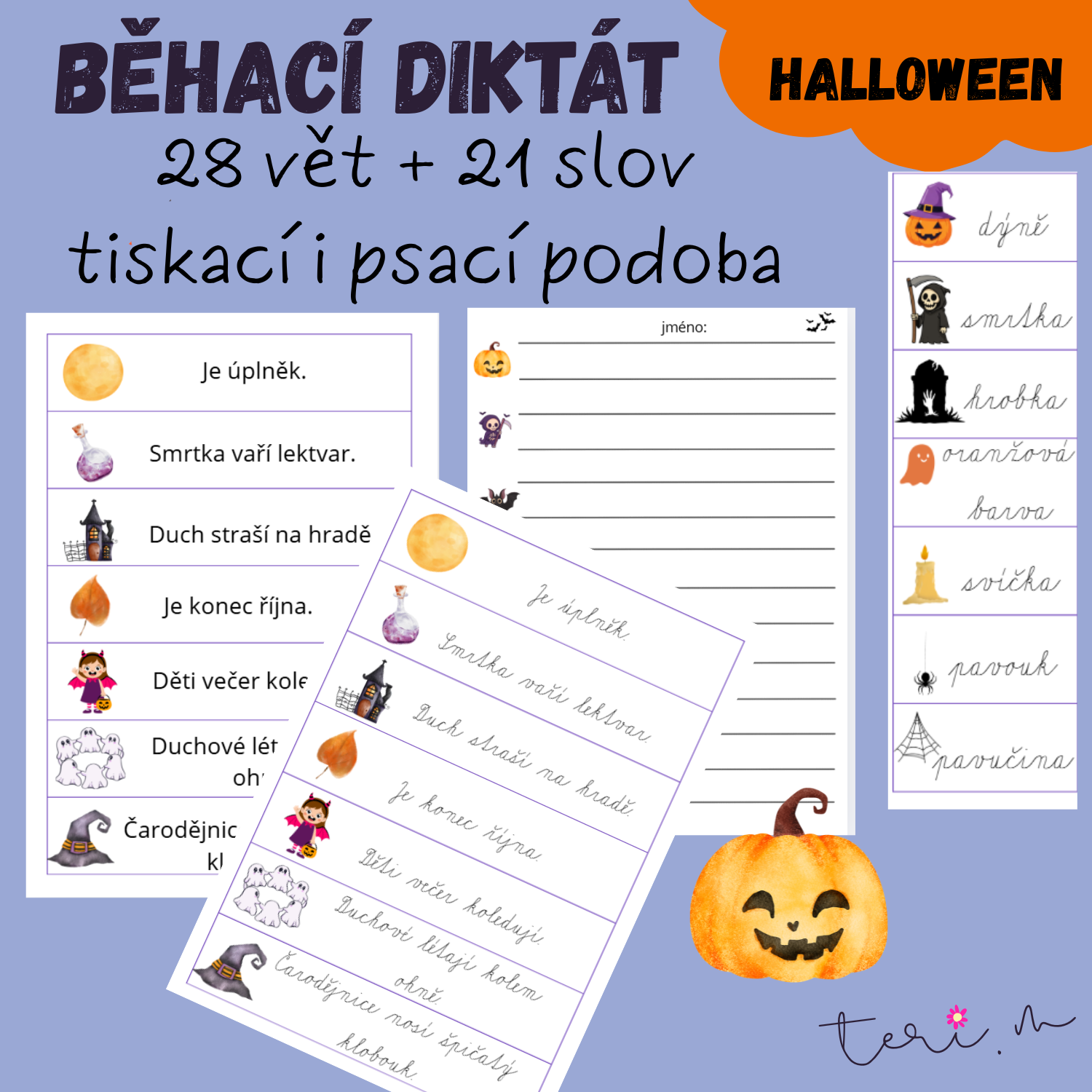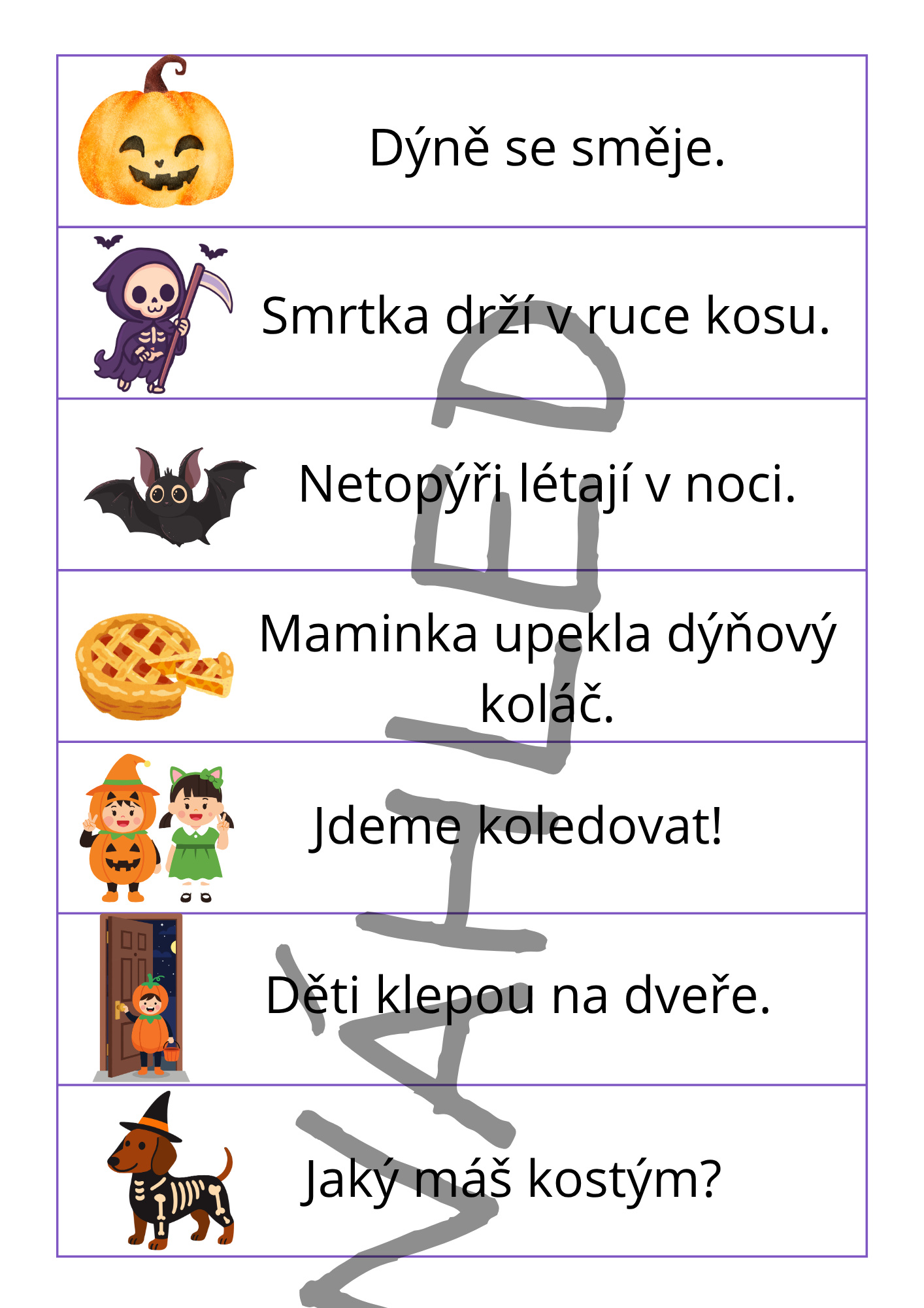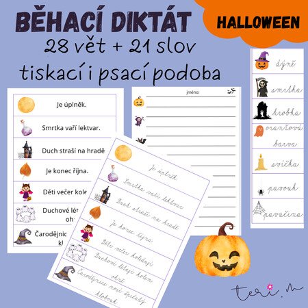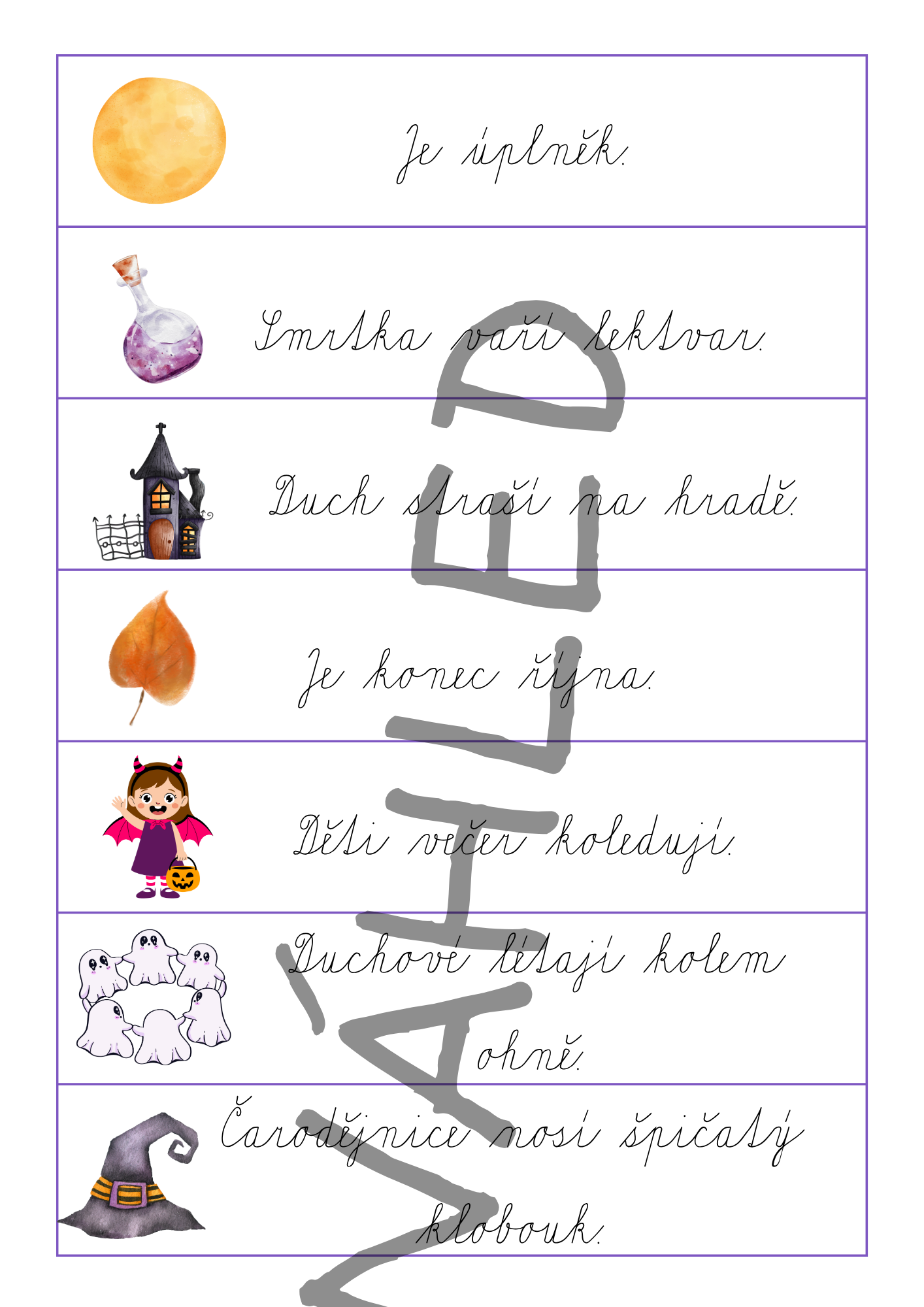 - materiál obsahuje 28 krátkých vět v tiskací i psací podobě a 21 samostatných halloweenských slov