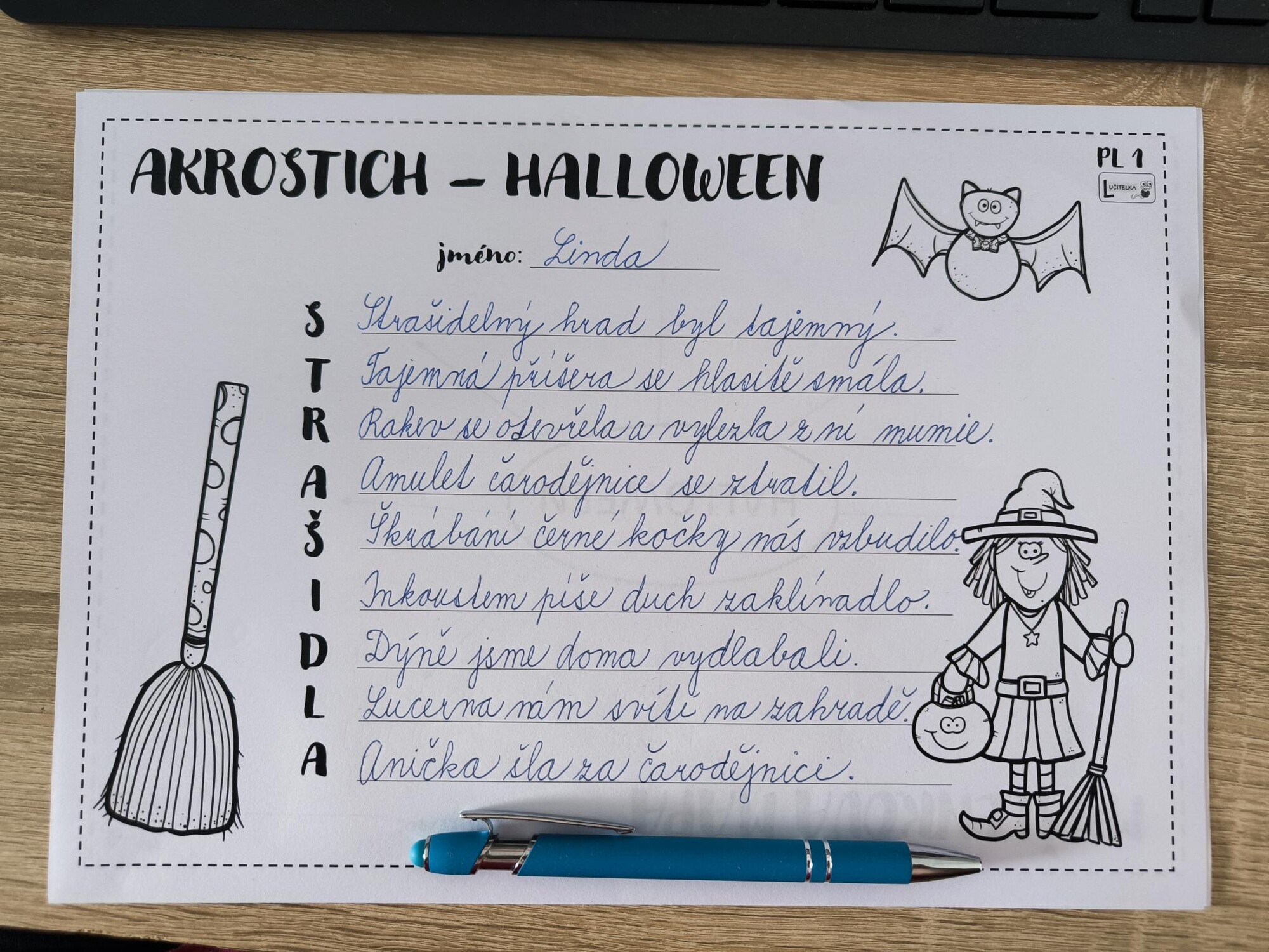 Pracovní list číslo 1 – AKROSTICH. Ke každému písmenu ze slova dětí tvoří větu, která začíná na dané písmeno a měla by být tematicky zaměřená.