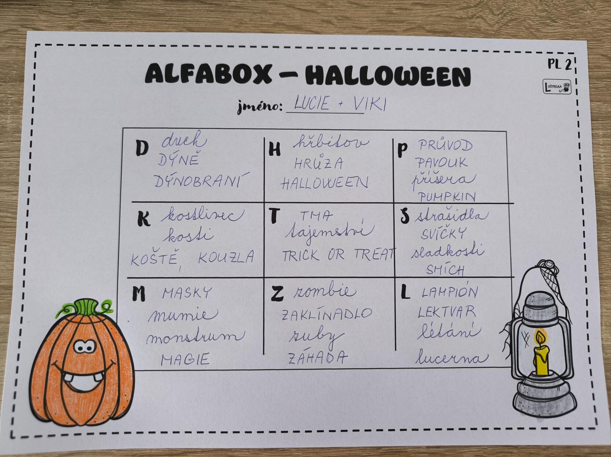 Pracovní list číslo 2 – ALFABOX. Aktivitu, kterou hrajeme na začátku i na konci hodiny. Klidně ve dvojicích. U každého písmene žáci zapisují slova, které souvisí s Halloweenem. Je na vás, zda budete vyžadovat 1-3 slova. Lze PL také jen promítnout na tabuli a doplňovat slova společně se třídou.