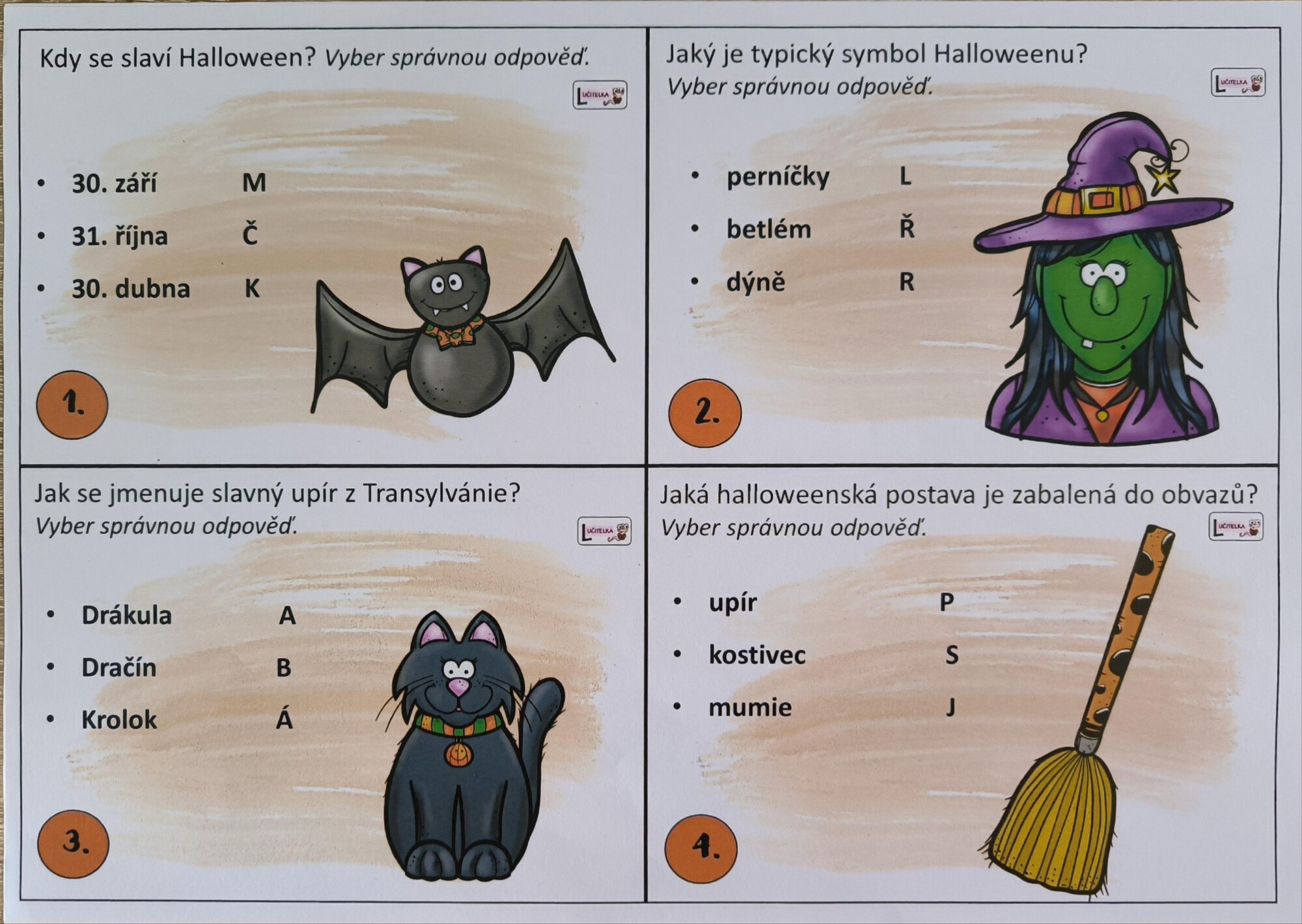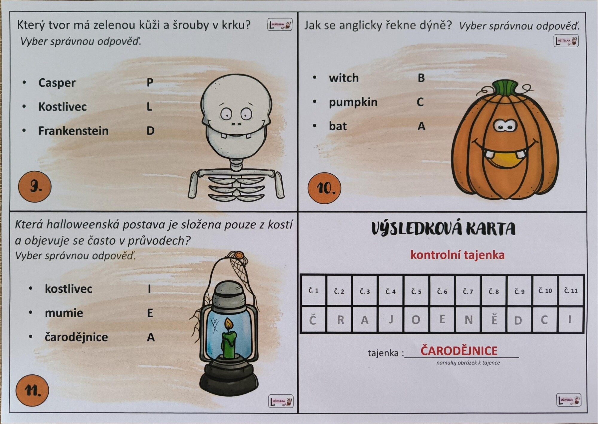 Každý žák obdrží výsledkovou kartu, do které si zapisuje písmena u správné odpovědi. Aktivitu lze využít i venku, v lese či na školní zahradě. Není důležité, u které karty žák začíná. Žáci si pouze musí hlídat číslo otázky do výsledkové karty. Tajenku každý zjistí po zodpovězení všech otázek. Písmena budou mít žáci promíchaná. Tajenku musí složit. Můžete žákům podat nápovědu – začáteční písmeno je Č. Součástí materiálu je i kontrolní tajenka ČARODĚJNICE. K tajence pak s dětmi hrajeme různé hry, které posilují třídní kolektiv a spolupráci mezi dětmi. Čarodějnice mohou děti kreslit i ve výtvarné výchově nebo modelovat halloweenská strašidla. Slabší žáci mohou pracovat ve dvojicích.