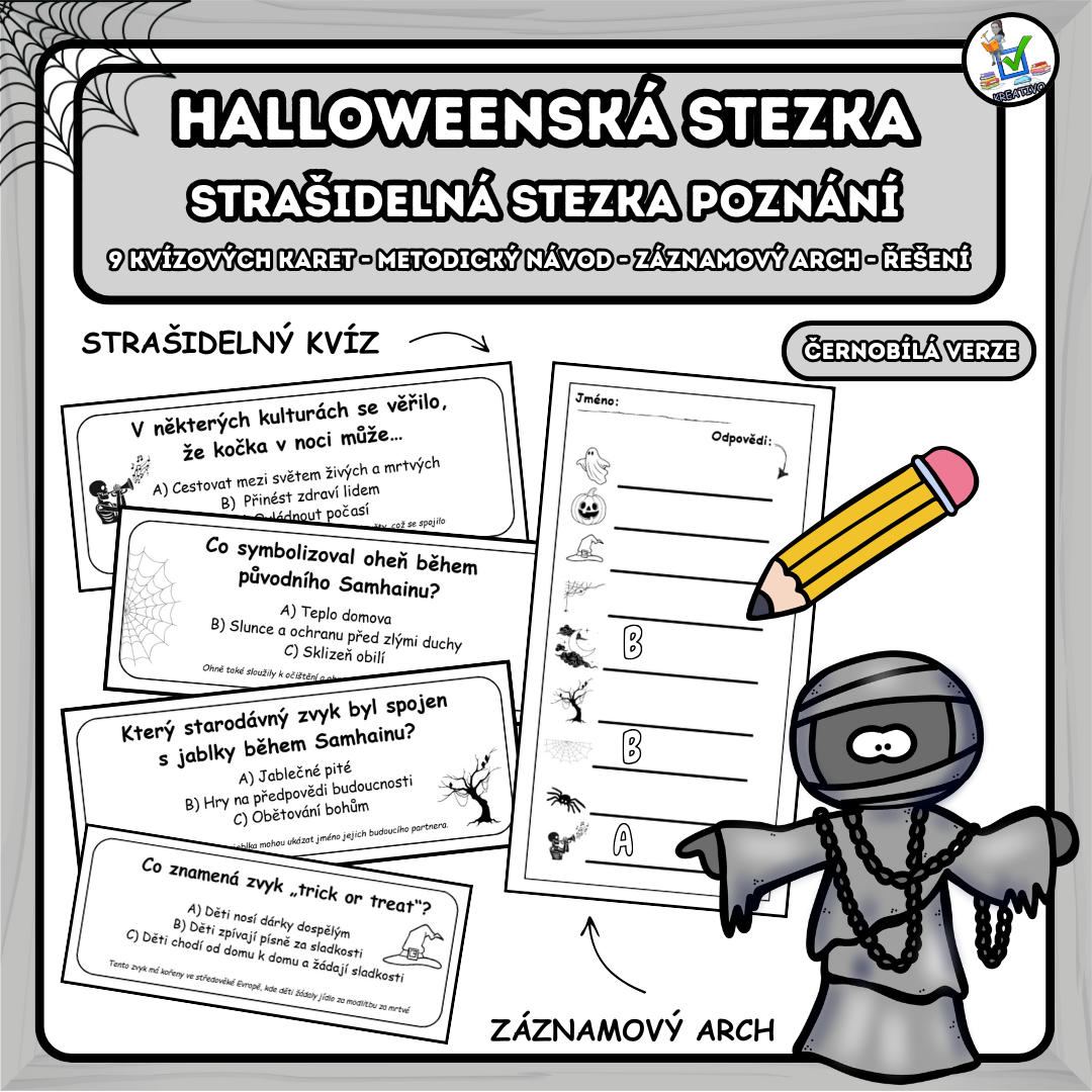 Materiál halloweenská stezka - strašidelná stezka poznání je zábavná a vzdělávací aktivita pro žáky, která spojuje prvky únikové hry, kvízu a školní stezky s halloweenskou tematikou.