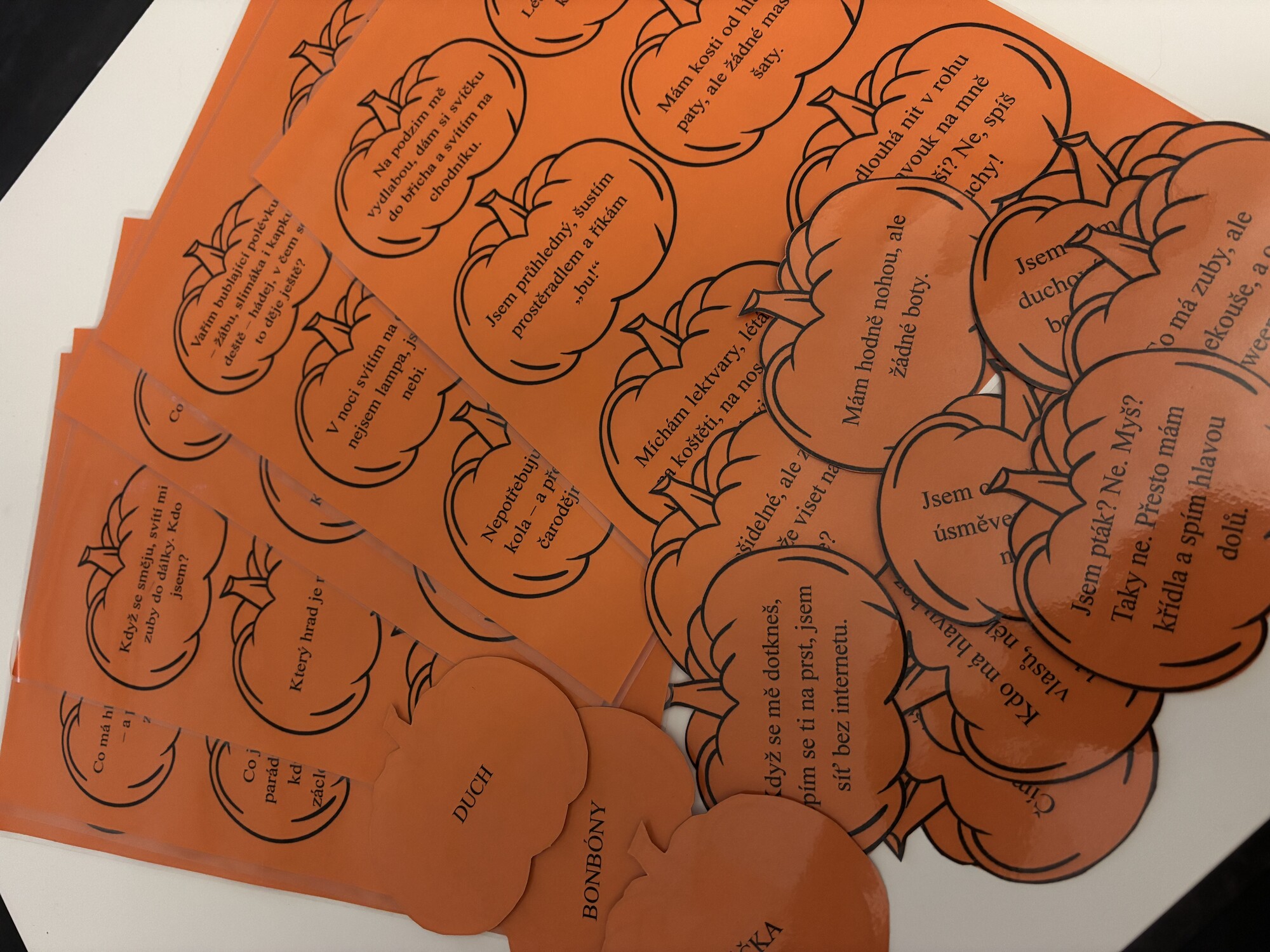 - 48 kartiček ve tvaru dýně (oboustranný tisk – hádanka + řešení)
