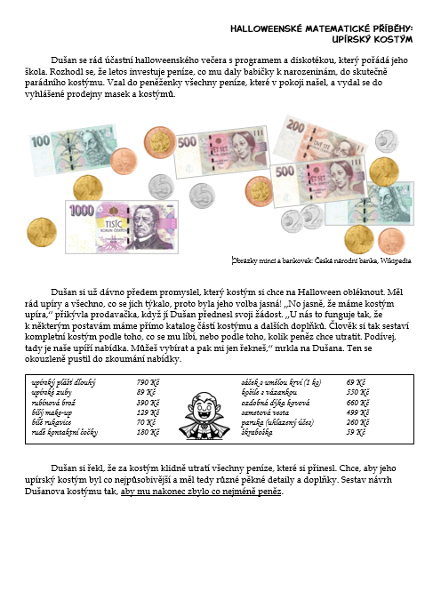 Materiál je určen zejména vyučujícím matematiky ve 4. a 5. třídě, kteří žákům rádi nabízejí tematicky laděné materiály. Obsahem tohoto materiálu jsou 3 pracovní listy s halloweenskými příběhy, jejichž nedílnou součástí jsou různé jednoduché výpočty.