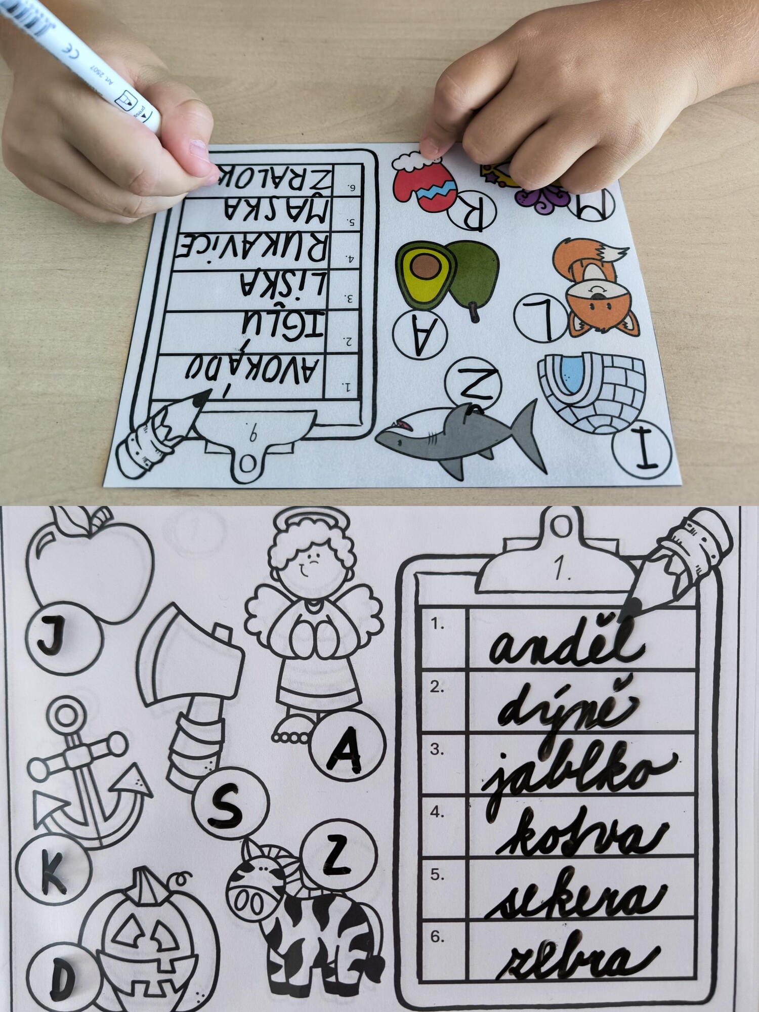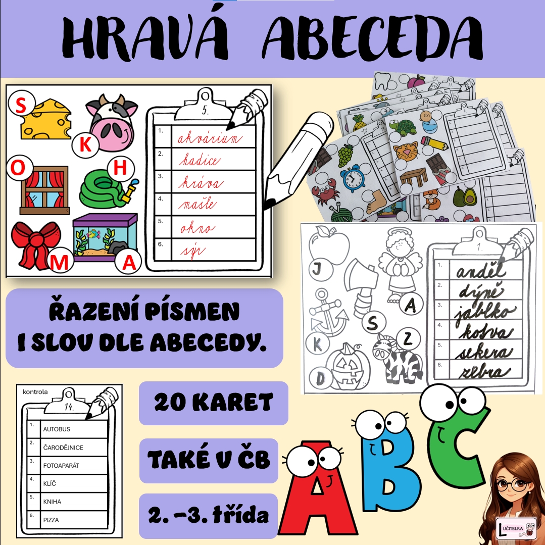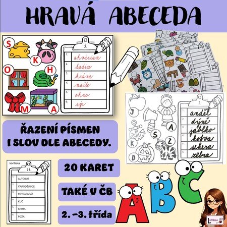 Cílem materiálu je procvičit si abecední řazení písmen i slov. Materiál obsahuje i gradované karty. Žáci mají za úkol zapsat k obrázkům do kroužku počáteční hlásku, hlásky seřadí dle abecedy a zapíší vedle do řádků. Druhá varianta – opět žáci zapisují jako první počáteční hlásky a poté slova k obrázkům seřadí a zapíší na řádky dle abecedy.