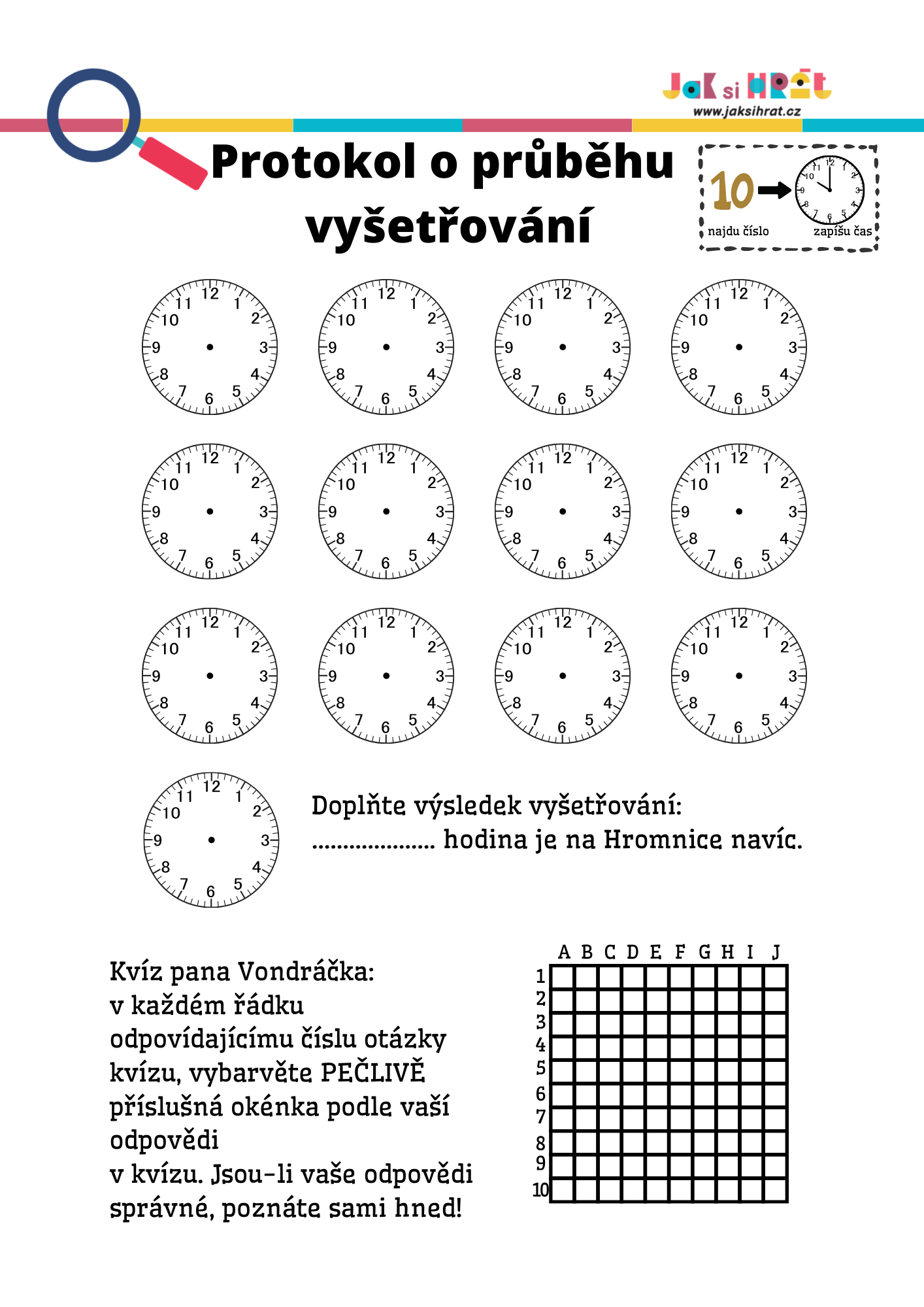 Materiál obsahuje 13 stanovišť, protokol do kterého děti zapisují čas do ciferníků a závěrečný kvíz, ve kterém si děti samy mohou otestovat, zda dávaly dobrý pozor.