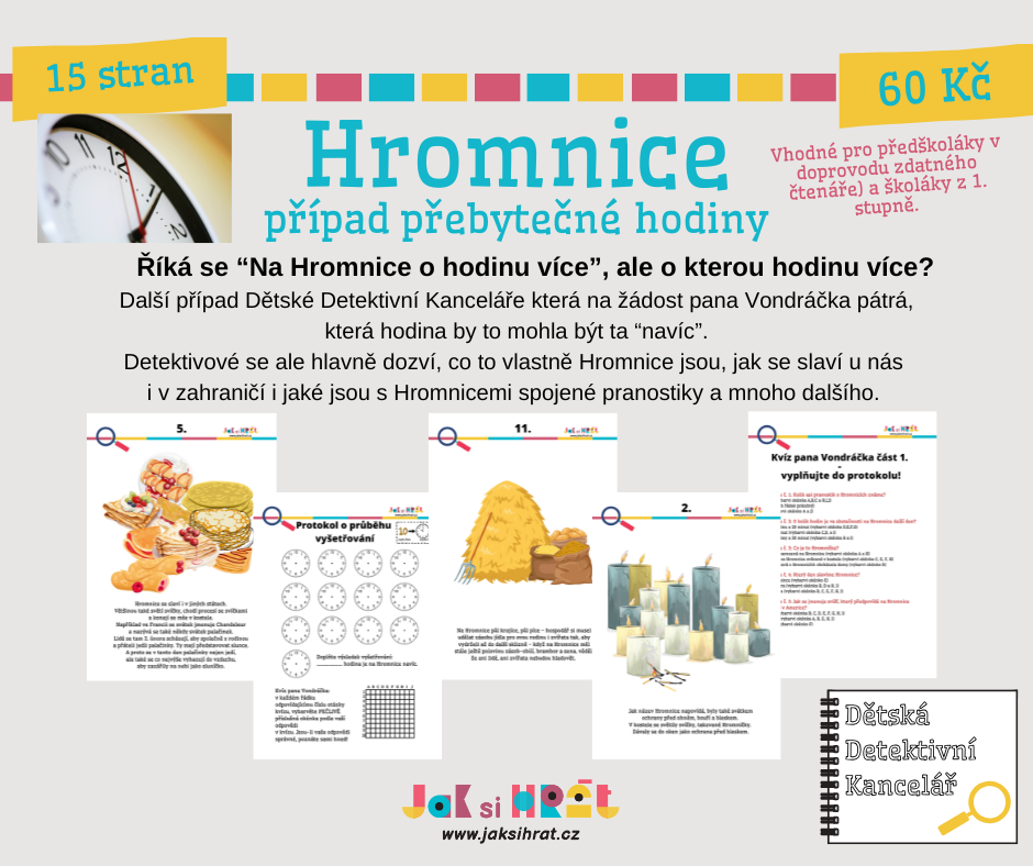 My máme pro děti další případ Dětské detektivní kanceláře, ve kterém budou pátrat, která hodina je vlastně "ta navíc" a navíc se o Hromnicích mnoho dozví.