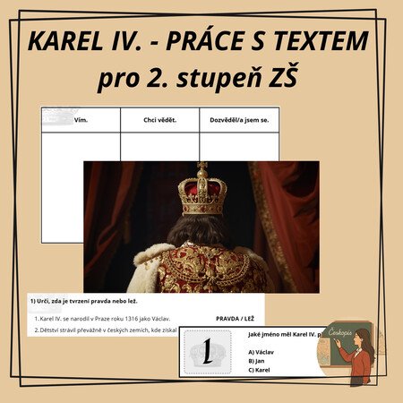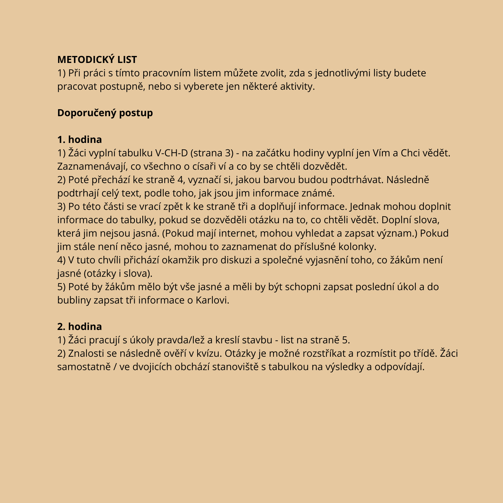 Materiál obsahuje text o císaři Karlu IV. a několik pracovních listů, které pracují s informacemi. Informace získané z textu si mohou žáci ověřit v otázkách na stanovištích. Metoda práce s textem, V-CH-D, známé/neznámé, pravda/lež.