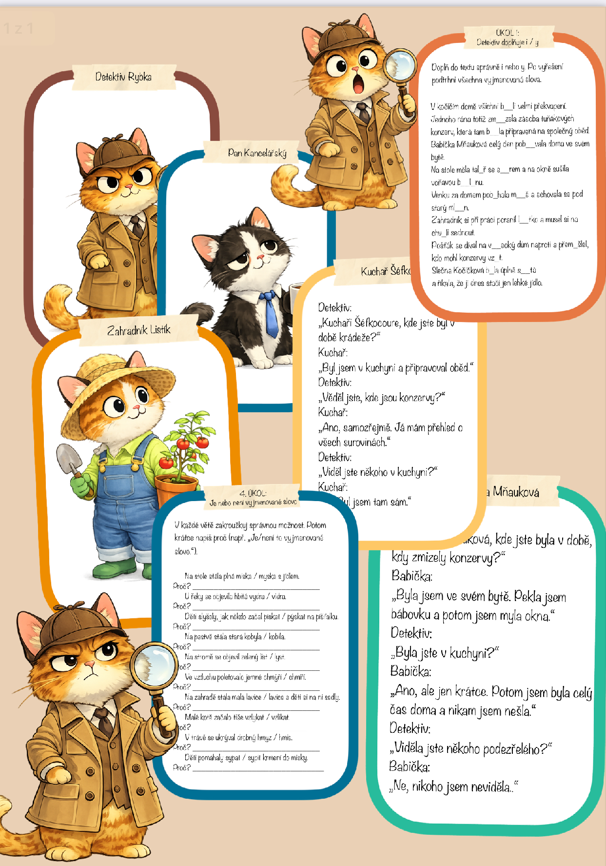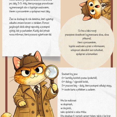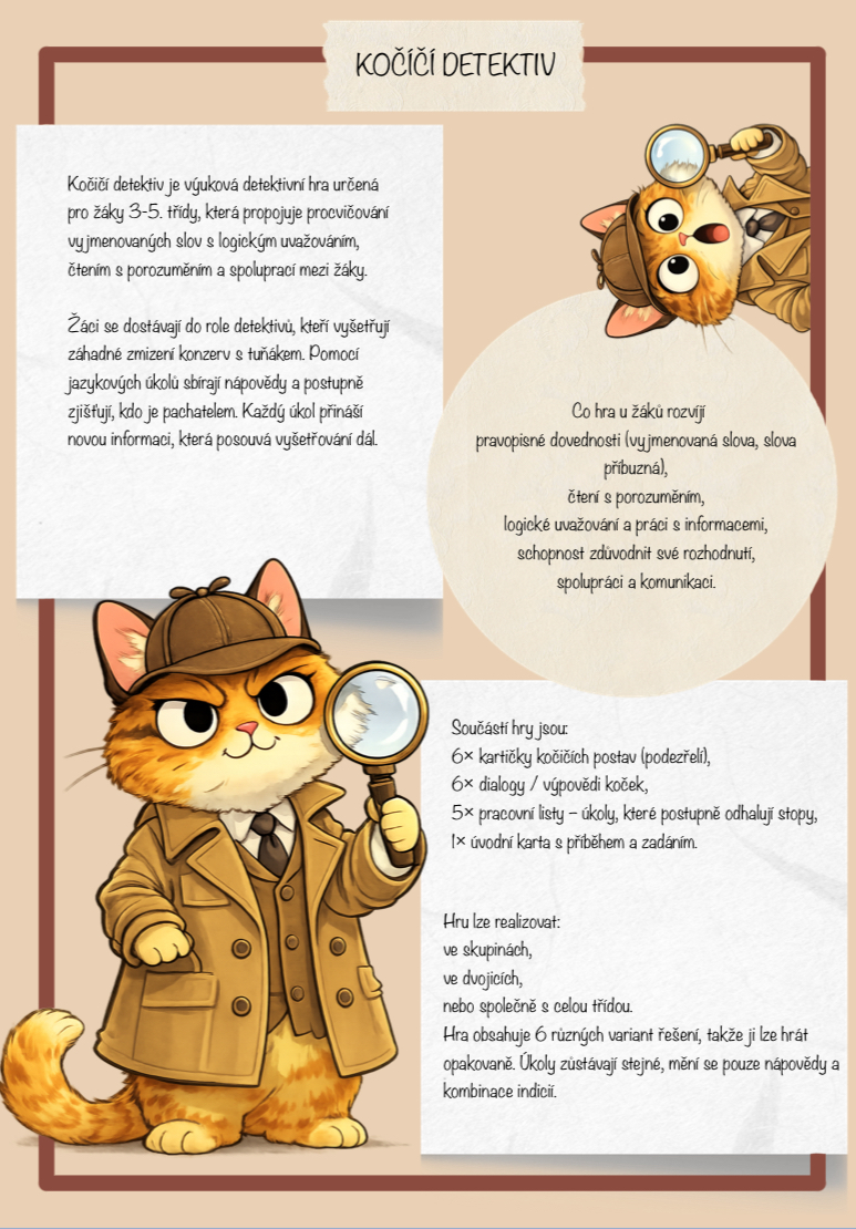 Kočičí detektiv je výuková detektivní hra určená pro žáky 3-5. třídy, která propojuje procvičování vyjmenovaných slov s logickým uvažováním, čtením s porozuměním a spoluprací mezi žáky.