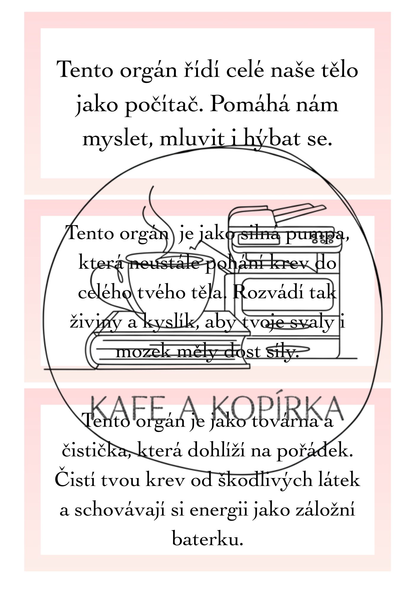 Kartičky: s názvy a popisem jednotlivých orgánů