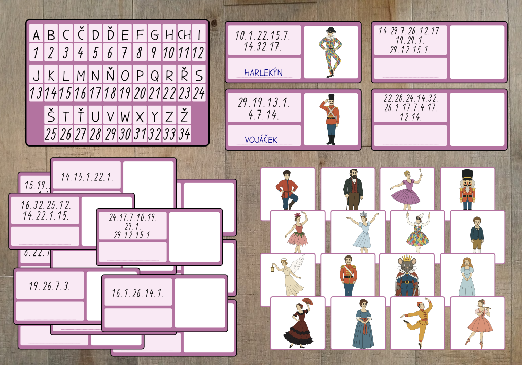 Aktivita obsahuje 12 karet s obrázky přísad do lektvarů a číselnou šifru názvu přísady. Úkolem je vyluštit název a přiřadit obrázky.