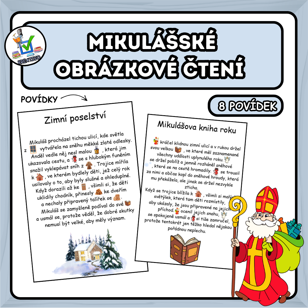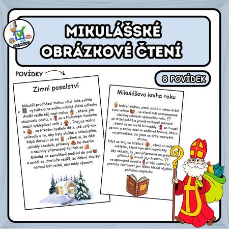 Tento jedinečný výukový materiál Mikulášské obrázkové čtení přináší dětem osm krátkých zimních a mikulášských povídek, ve kterých jsou některá slova nahrazena obrázky. Díky tomu si děti hravou formou procvičují porozumění textu, slovní zásobu, logické myšlení i čtenářskou gramotnost.