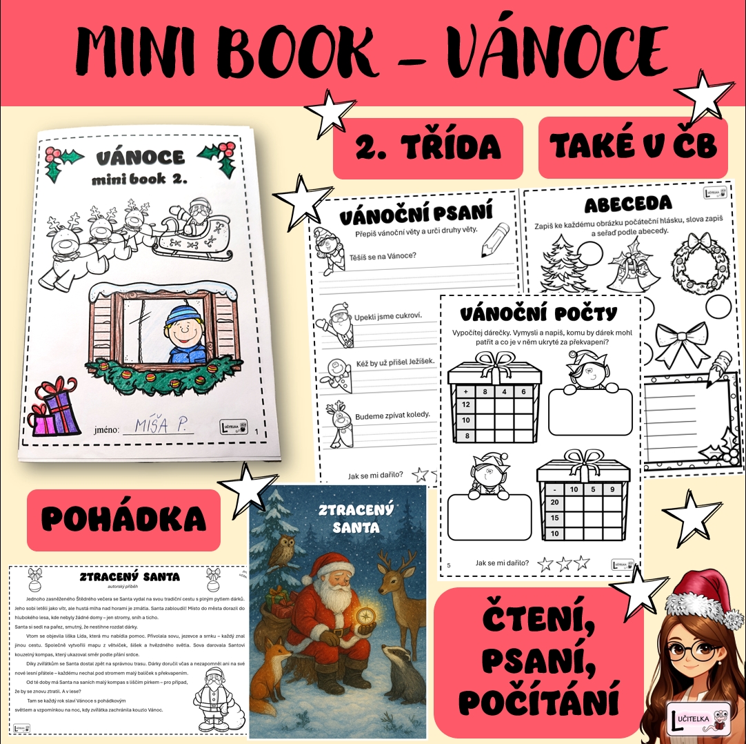 Cílem materiálu je zopakovat si učivo a vytvořit si mini knížku na téma Vánoce, která je přizpůsobená dětem v 2. třídě. V materiálu si děti procvičí sluchové vnímání první hlásky a řazení slov dle abecedy, čtení s porozuměním, sčítání a odčítání do 20 s přechodem, druhy vět i psaní…a další učivo. Materiál rozvíjí i logické myšlení. Materiál lze využít v hodinách českého jazyka/matematiky nebo v hodinách pracovní výchovy. Materiál můžete využít i jako týdenní/měsíční/ domácí úkol nebo pro rychlíky, jako práce navíc.