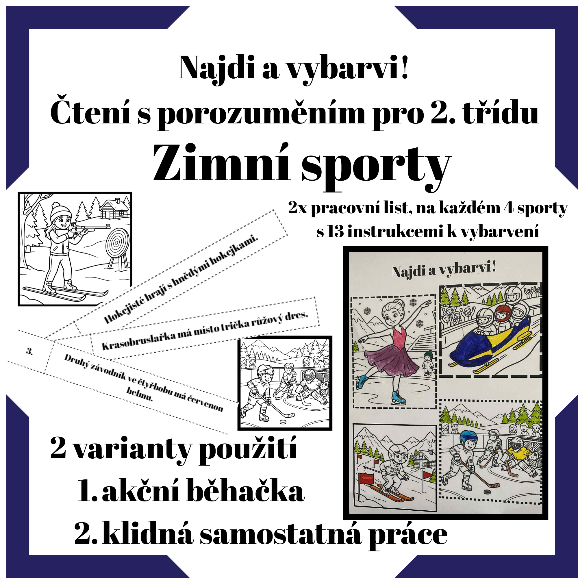 Najdi a vybarvi! Čtení s porozuměním na téma zimní sporty pro 2. třídu