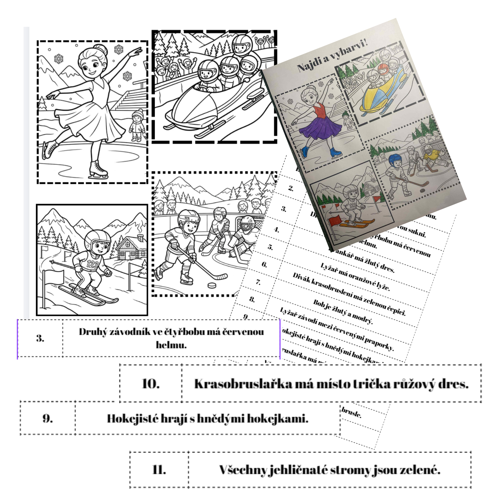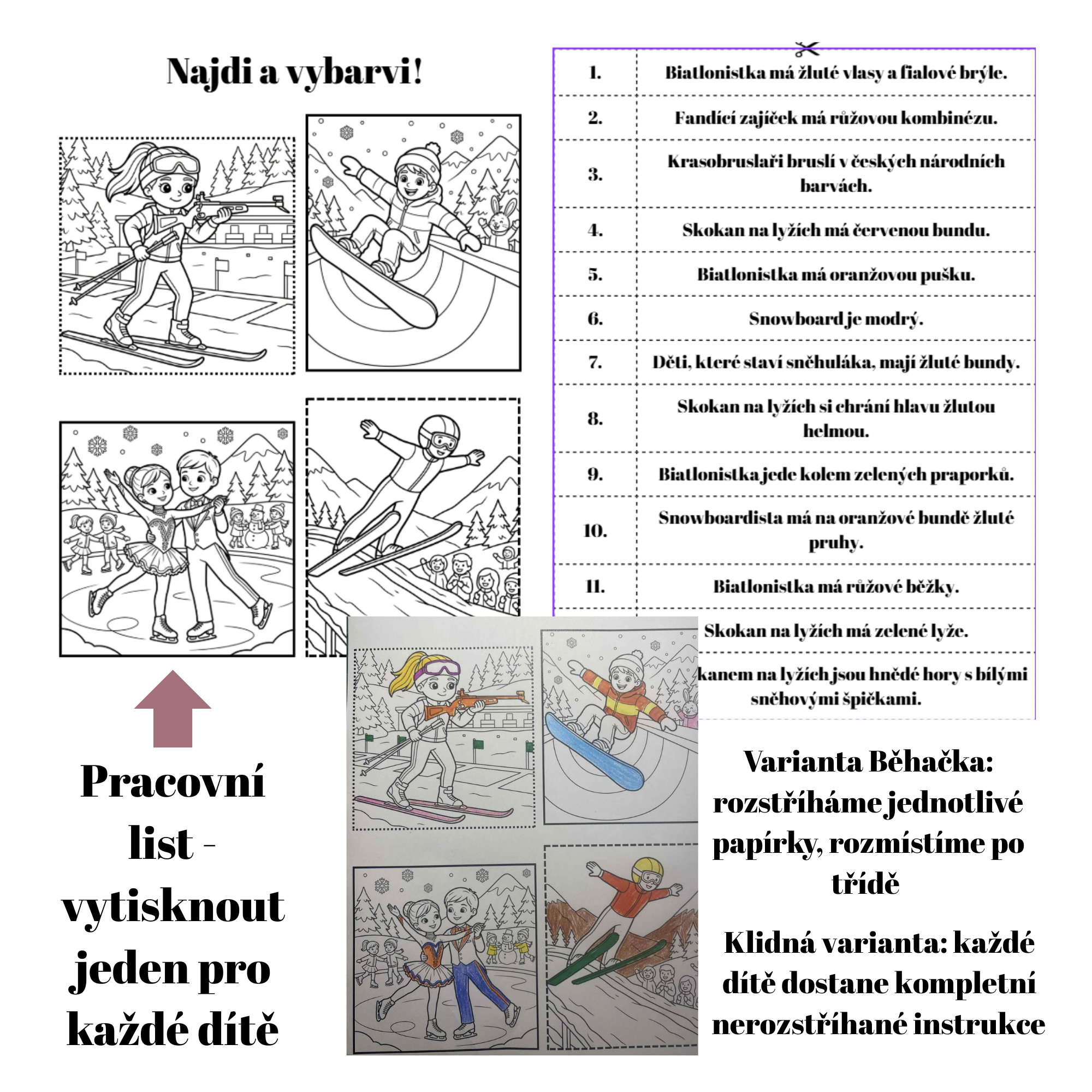 Aktivita zábavnou formou rozvíjí čtení s porozuměním – děti vybarvují čtyři zimní sporty přesně podle psaných instrukcí. Materiál lze využít jako akční běhačku, kde děti hledají a pamatují si pokyny rozmístěné po třídě, nebo jako klidnou samostatnou práci.