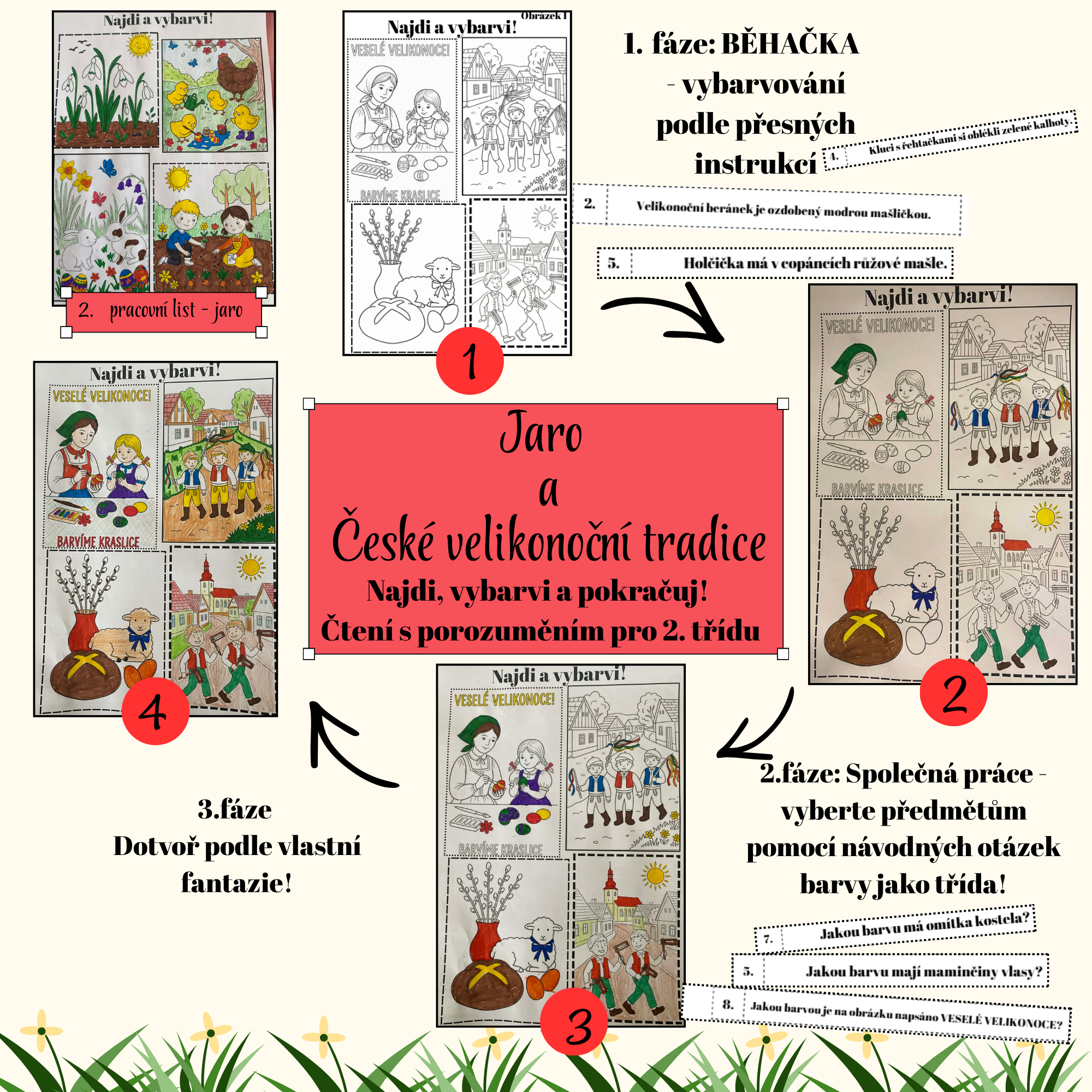 Procvičte čtení s porozuměním pomocí milých jarních omalovánek! Nejdříve se vybarvuje podle přesně daných instrukcí (běhačka), poté následuje společná práce a nakonec si každý dotvoří obrázky podle vlastní fantazie.