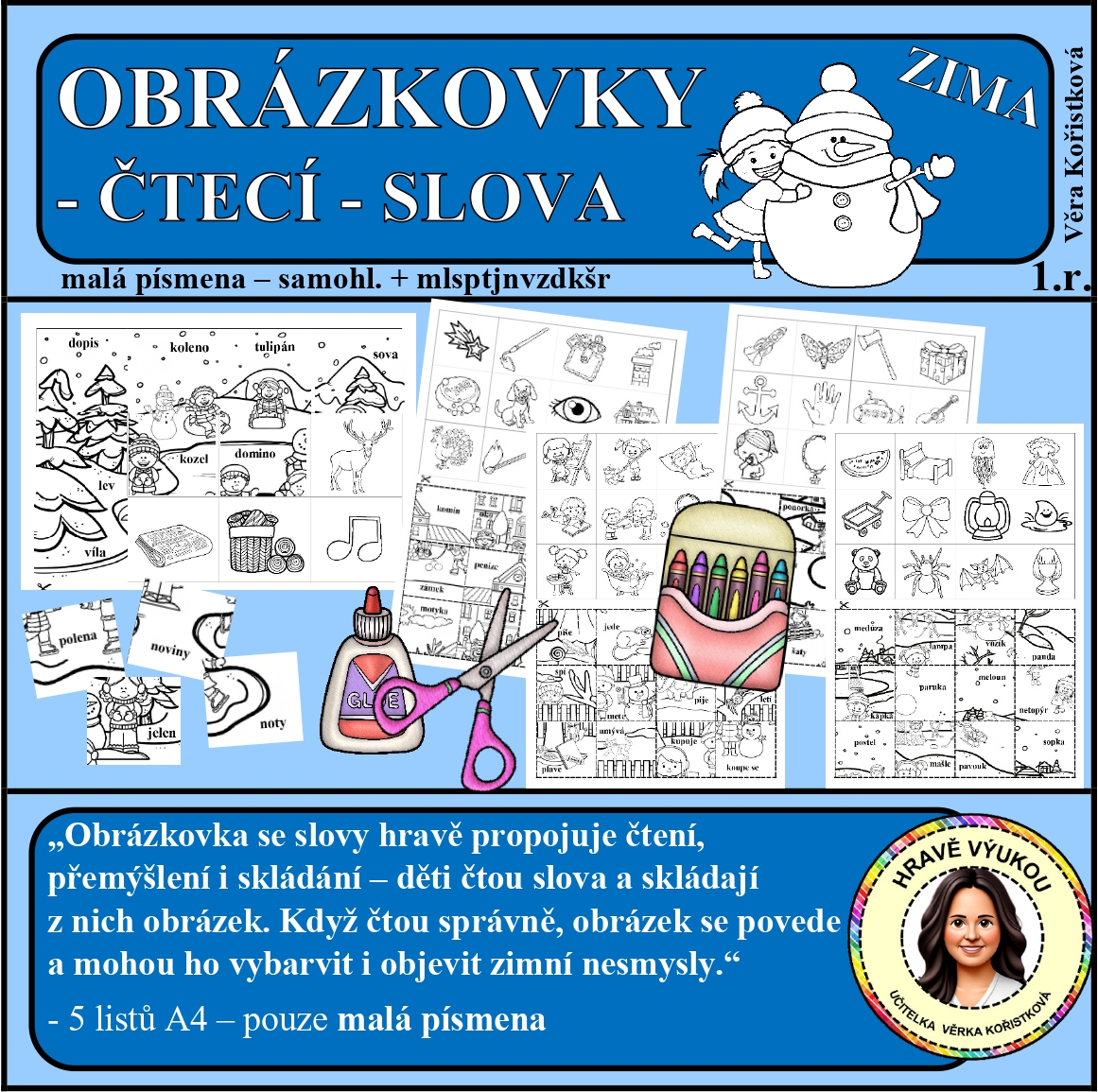 „Obrázkovka se slovy hravě propojuje čtení, přemýšlení i skládání – děti čtou slova a skládají z nich obrázek. Když čtou správně, obrázek se povede a mohou ho vybarvit i objevit zimní nesmysly.“