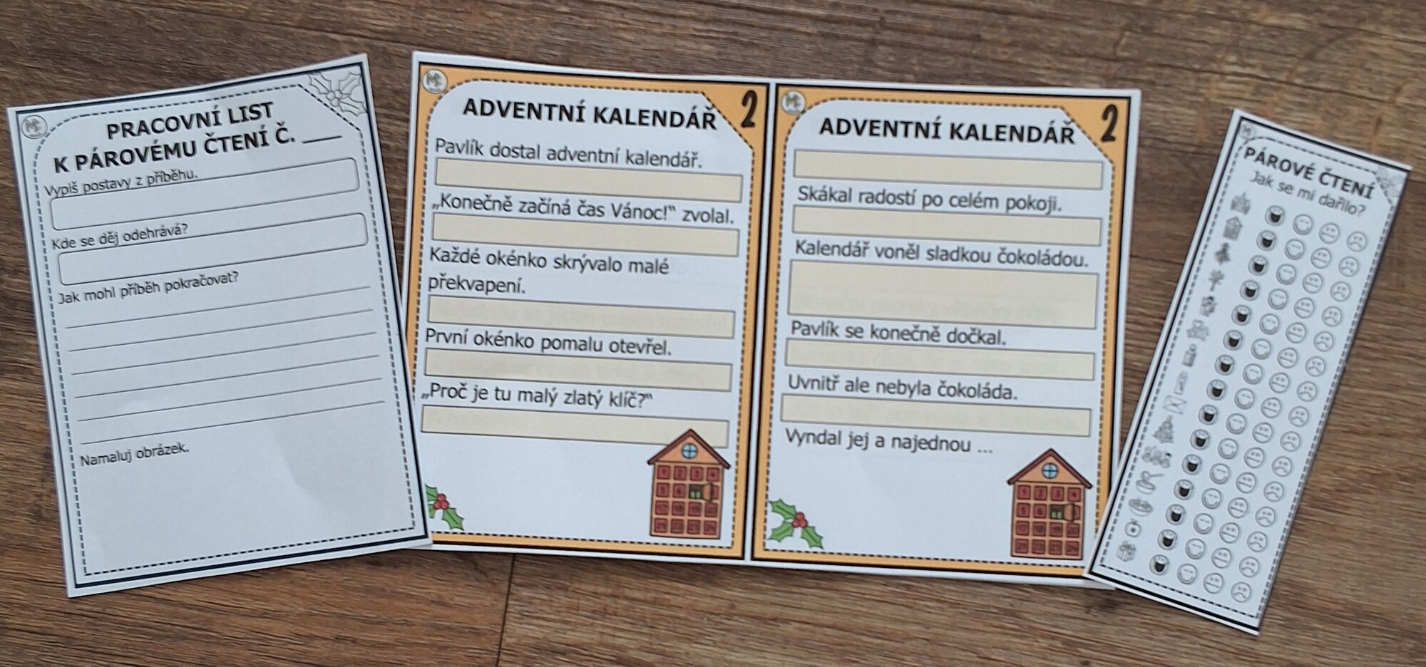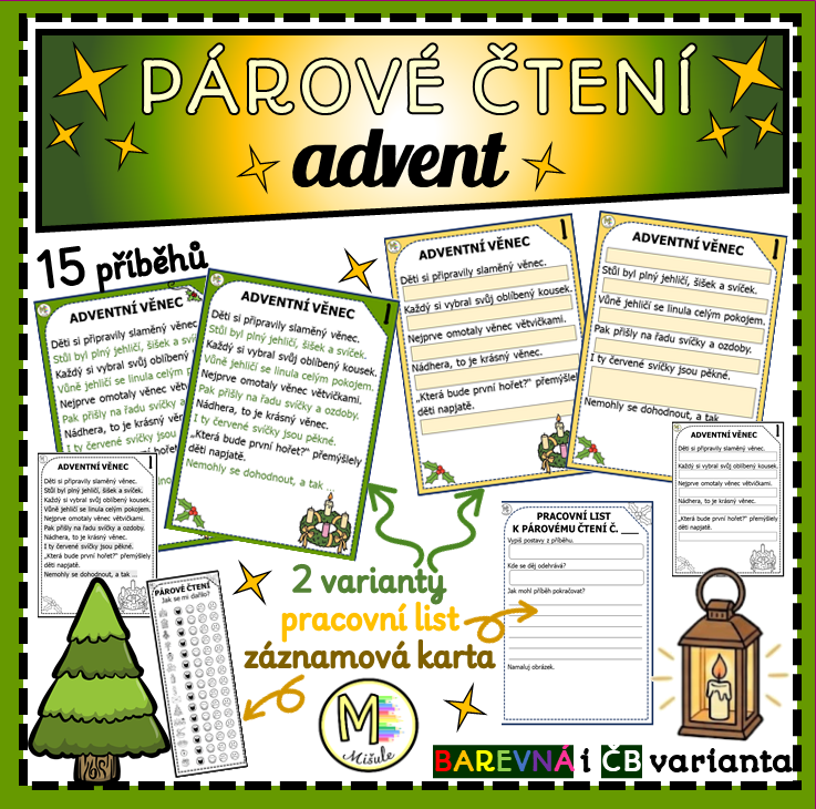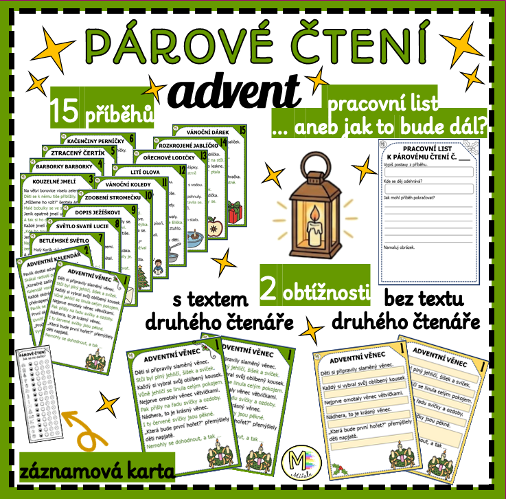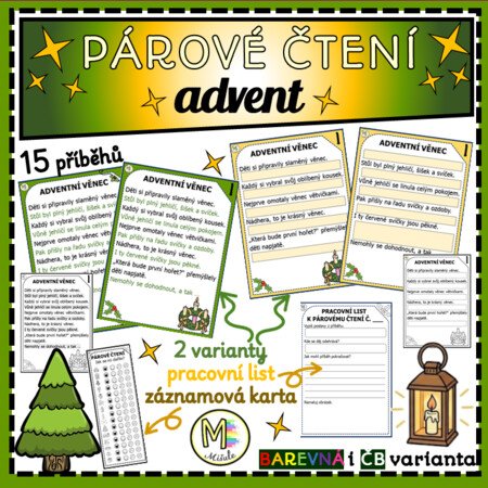 PÁROVÉ ČTENÍ – ADVENT je propracovaný výukový materiál určený pro rozvoj čtení s porozuměním, aktivního naslouchání, spolupráce a tvořivého psaní u žáků 1.–3. ročníku základní školy. Soubor obsahuje 15 originálních adventních příběhů, které jsou zpracovány tak, aby s nimi děti mohly pracovat ve dvojicích formou párového čtení. Každý příběh naleznete ve dvou kartách – jednu drží první čtenář a druhou druhý čtenář.