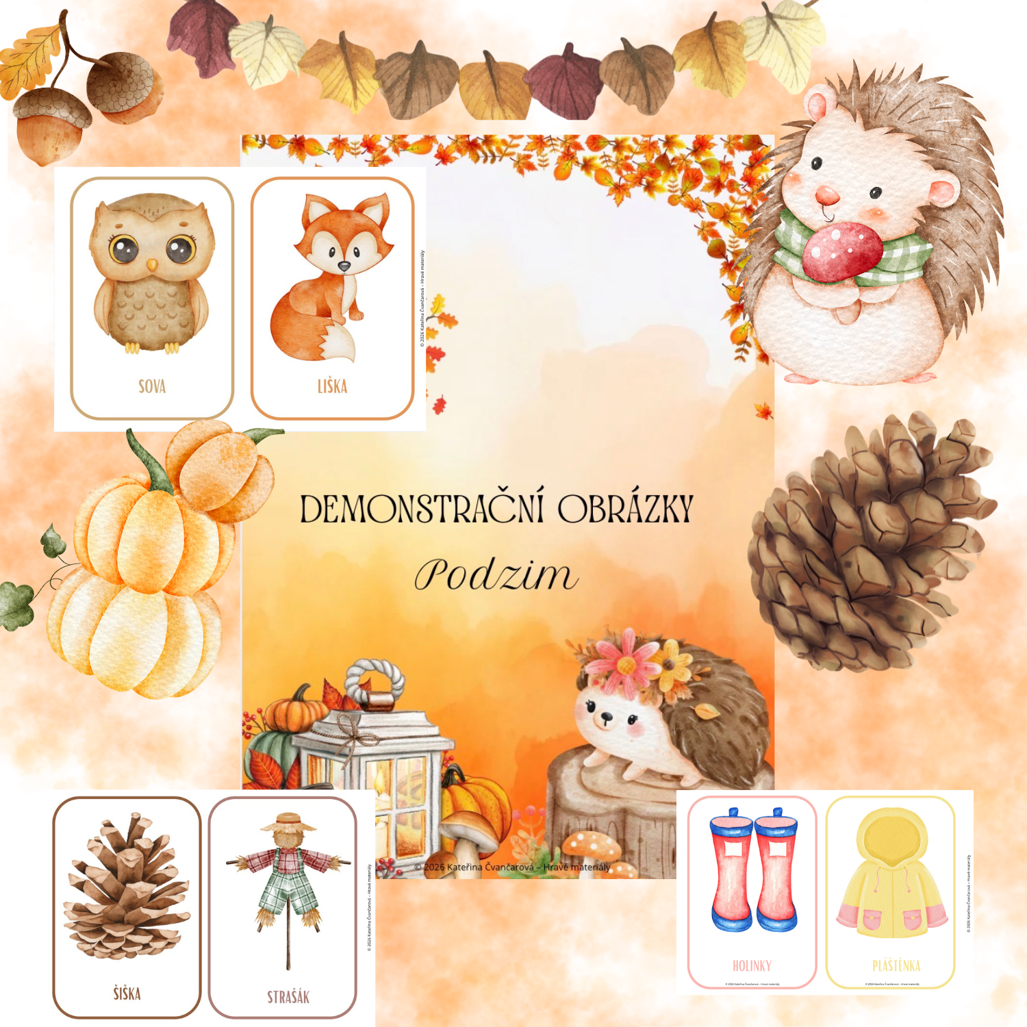 Vzdělávací soubor Demonstrační obrázky – Podzim 🍂 je určen pro děti mateřské školy a slouží jako názorná pomůcka při seznamování s podzimní tematikou. Materiál podporuje přirozené učení formou rozhovoru, pozorování a společného sdílení.