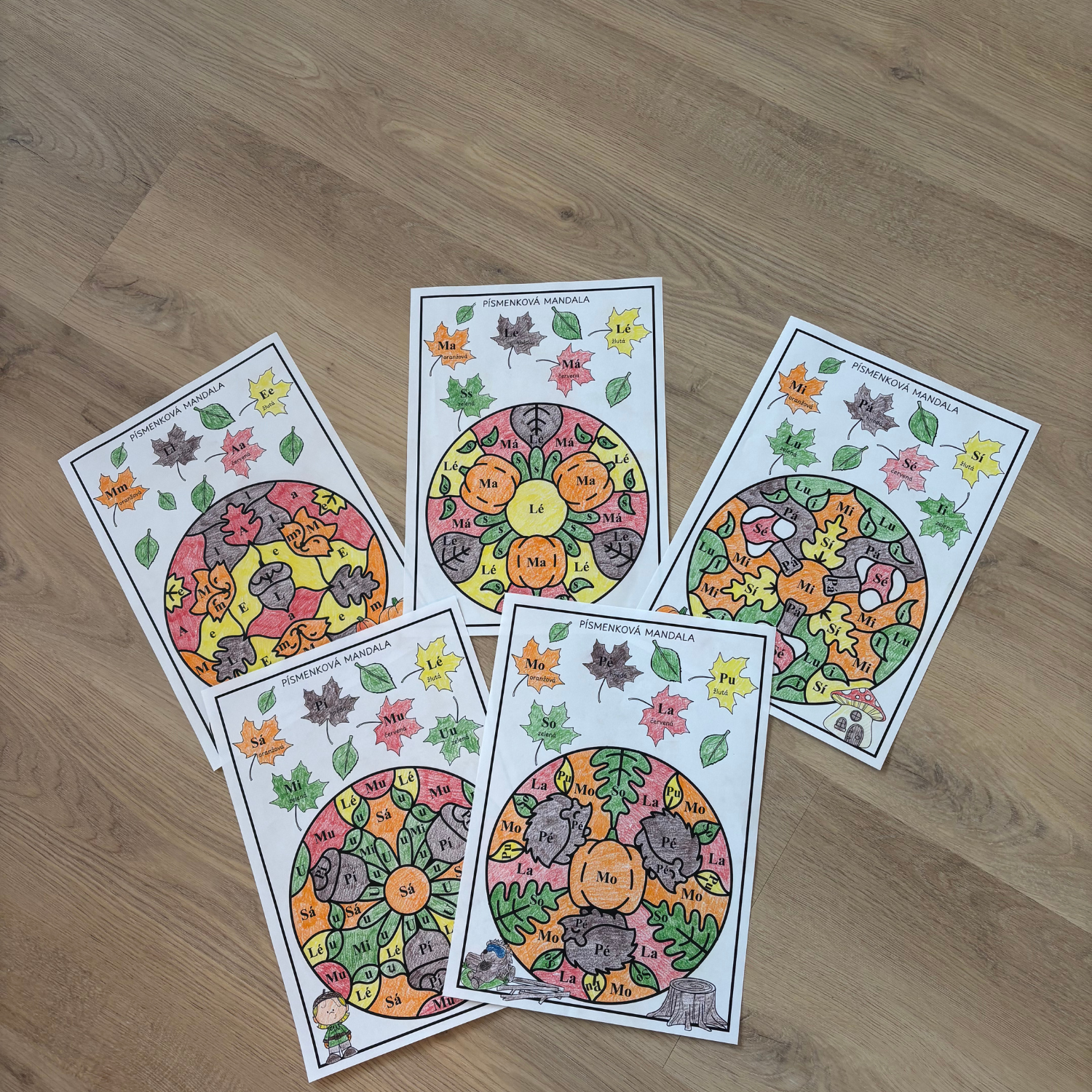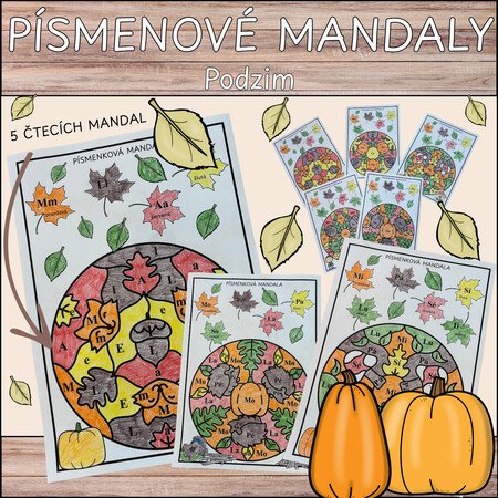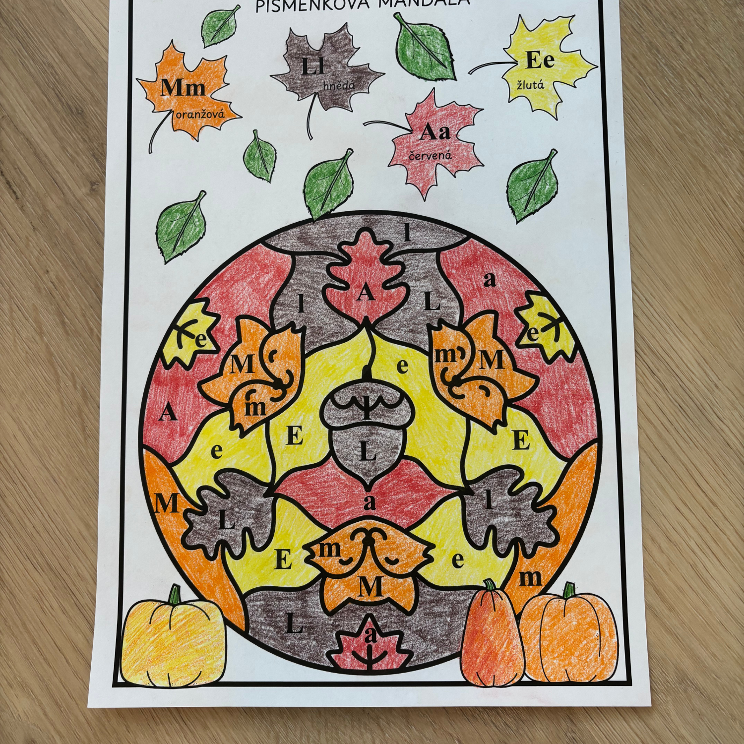 Materiál obsahuje pět pracovních listů s písmenkovými mandalami inspirovanými podzimní tematikou - písmena M, L, S, P, A, E, O, U, I. Aktivita je určena žákům první třídy a zaměřuje se na rozlišování a čtení písmen a slabik.