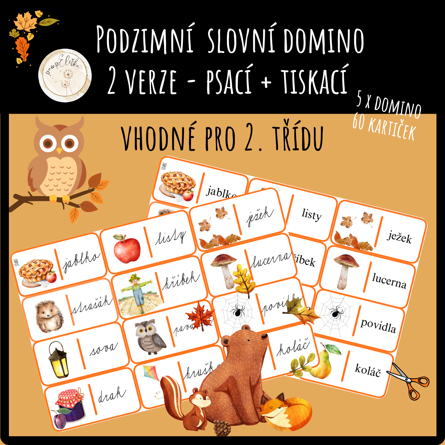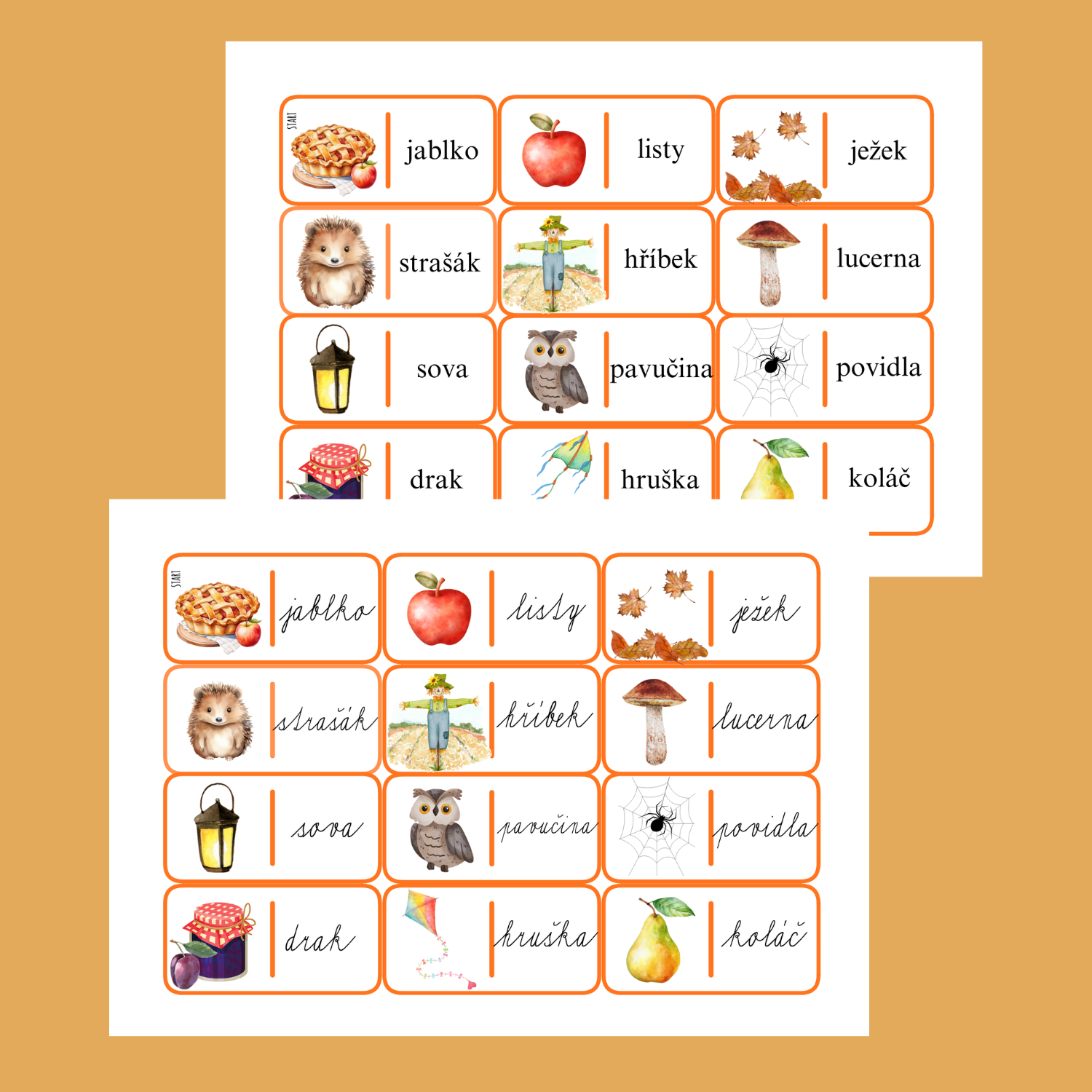 Materiál obsahuje 5 sad podzimního domina, přičemž každá sada je tvořena 12 kartičkami a má vždy k dispozici dvě verze – psací písmo a tiskací písmo. Na kartičkách jsou slova s podzimní tématikou a k nim odpovídající obrázky, přičemž první kartička každé sady je označena Slovem START.