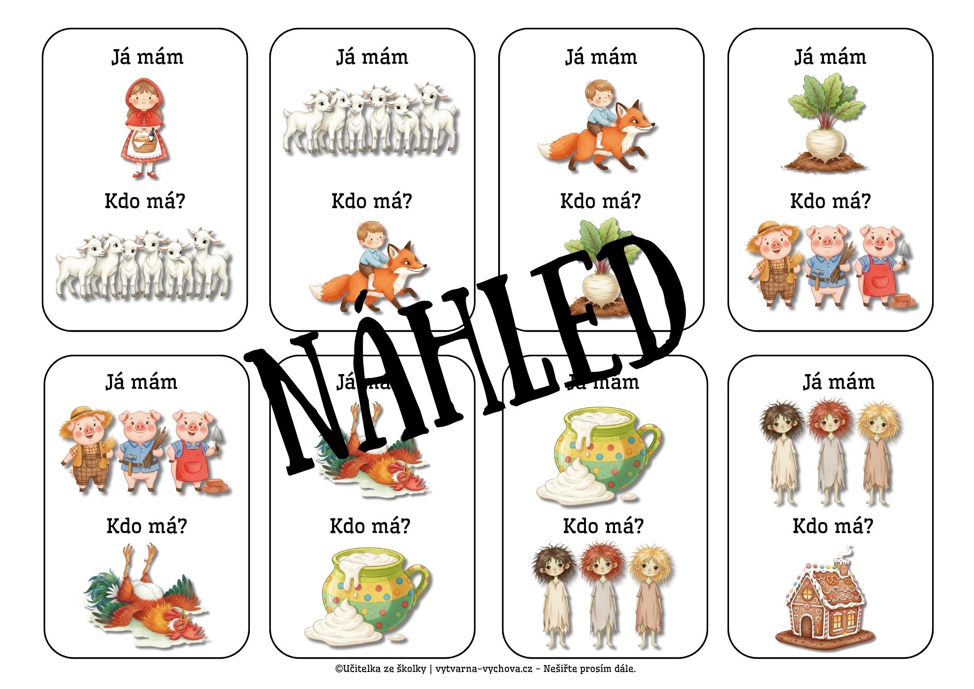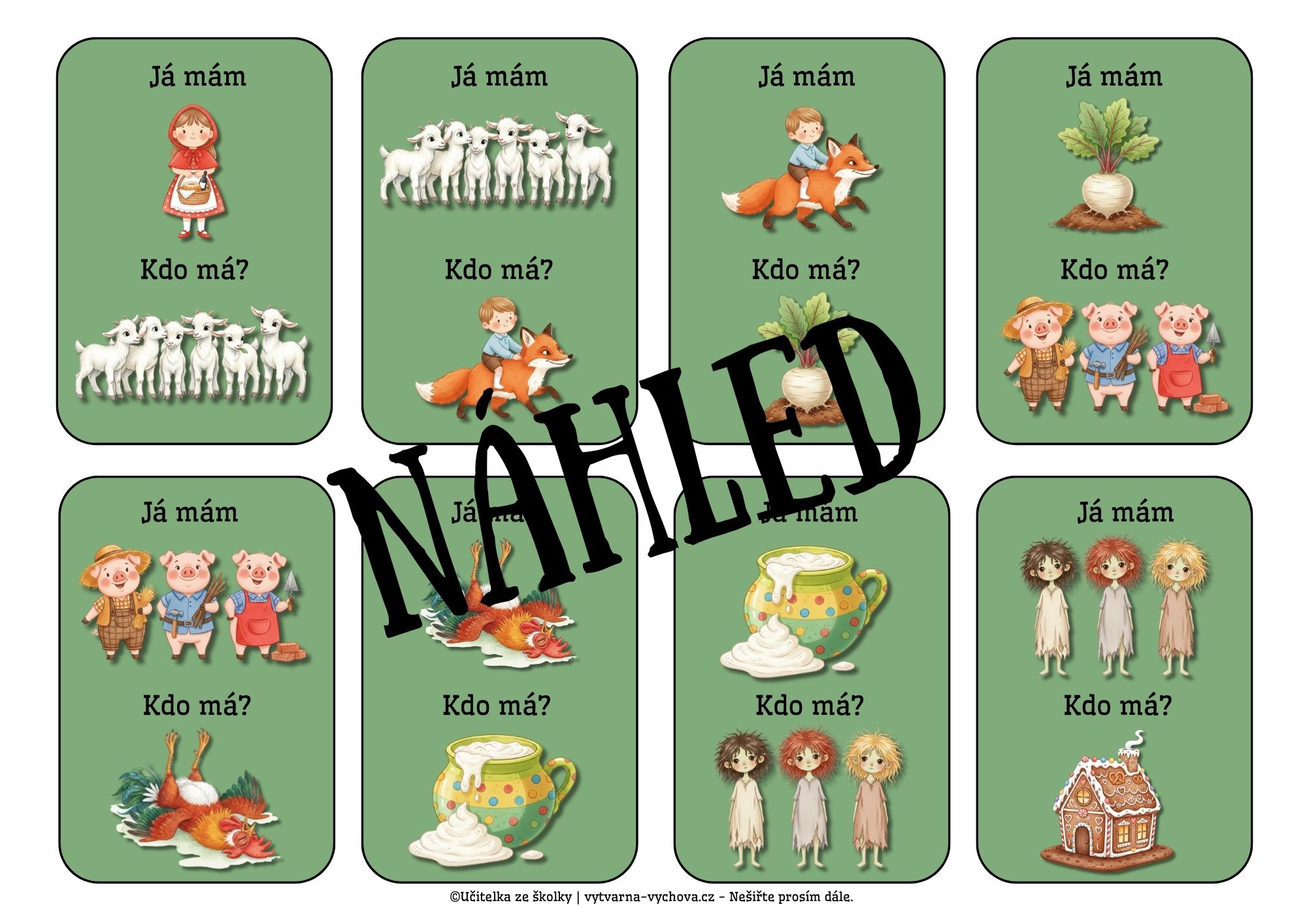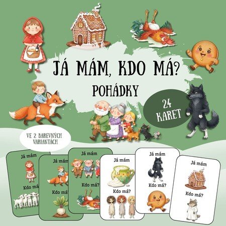 🏰 24 herních karet s motivy z 12 známých pohádek, přičemž každá pohádka je zastoupena dvěma různými obrázky (např. vlk / Karkulka, Perníková chaloupka /Jeníček a Mařenka), které jsou mezi kartami promíchány. Celá sada je zhotovena ve dvou barevných variantách – s estetickým zeleným podbarvením a v úsporné verzi s bílým pozadím pro šetření toneru.