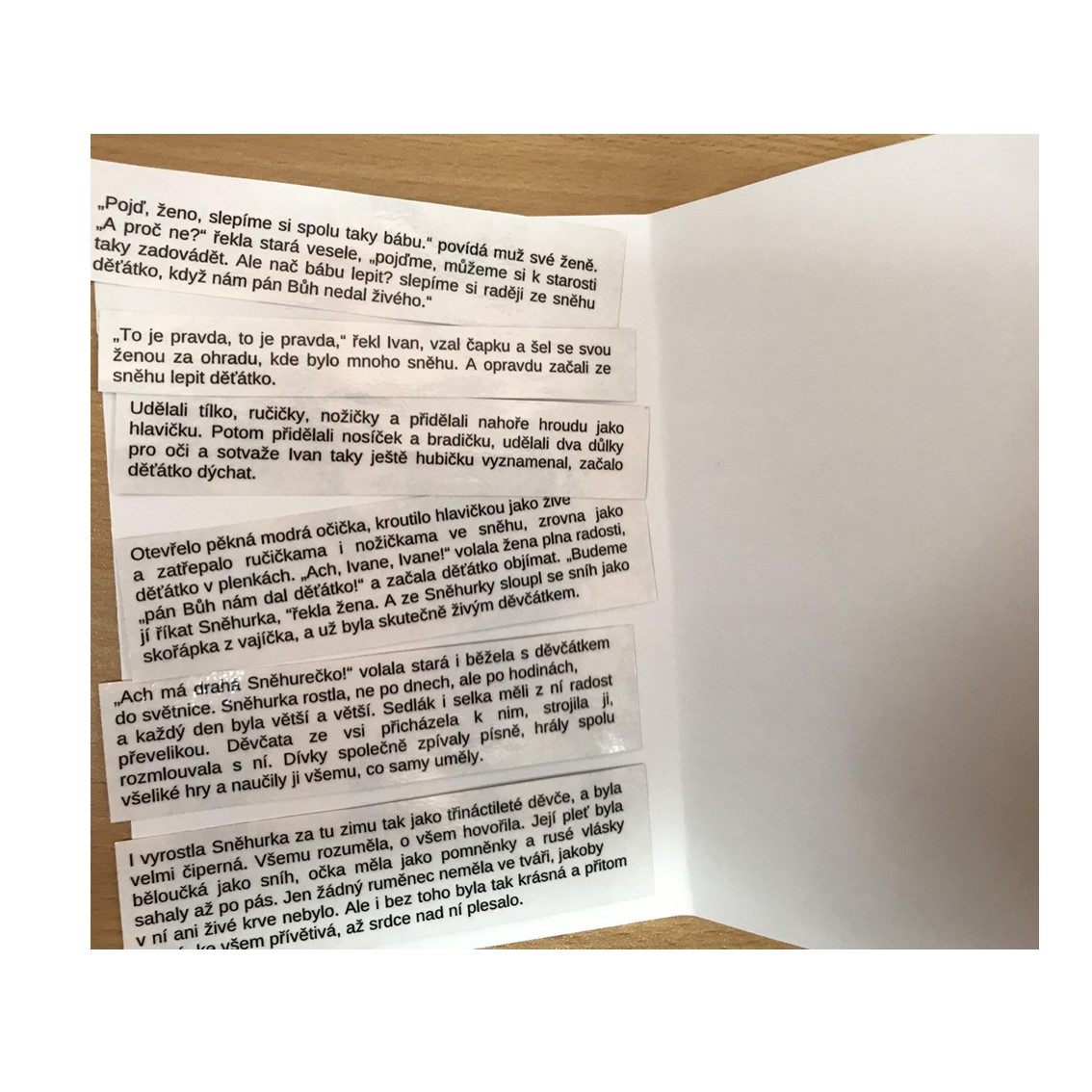 Každá strana A4 obsahuje dvě karty s pohádkovými texty. Z druhé strany karty je obrázek. Texty je potřeba po vytištění rozstříhat podle odstavců.