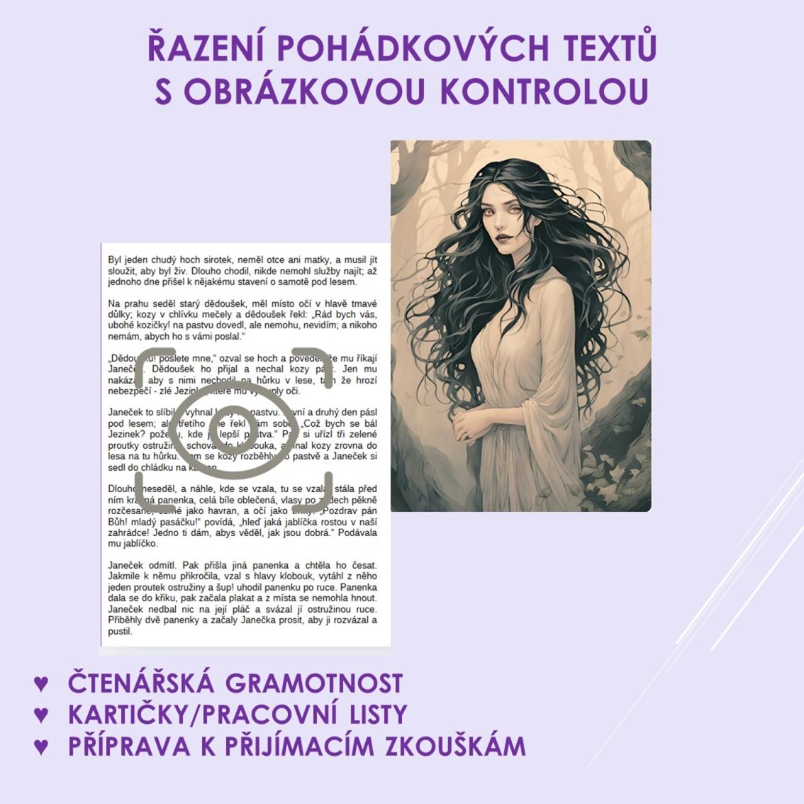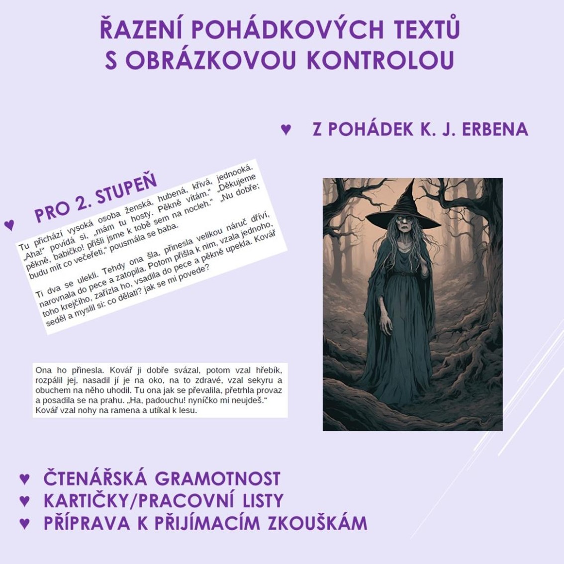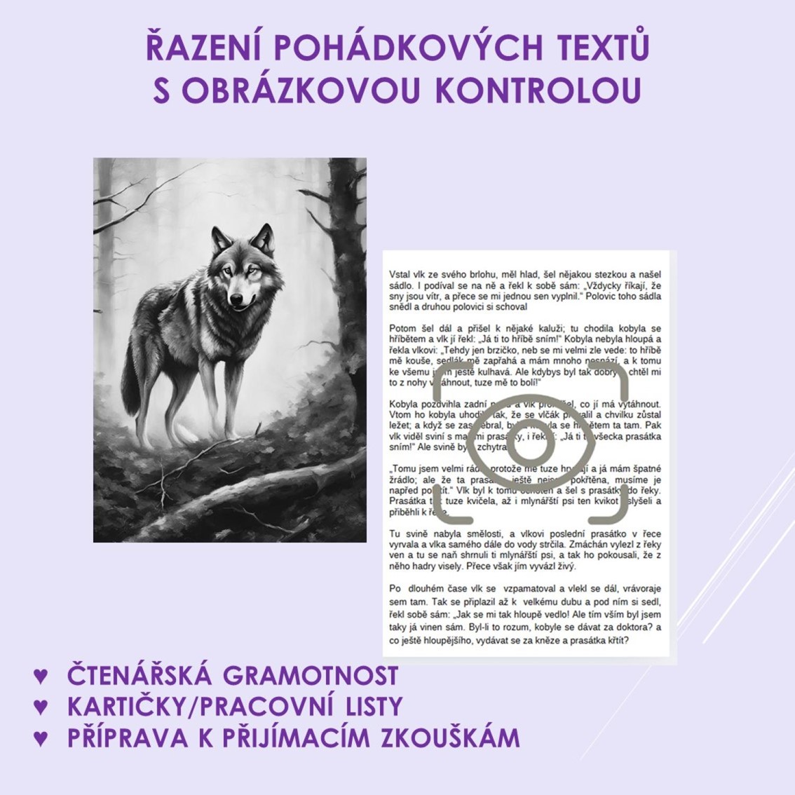 Řazení pohádkových textů s obrázky ke kontrole. Vhodné i k přípravě na přijímací zkoušky. Jedná se o pohádkové texty, ale není to pro všechny žáky úplně jednoduché. Některé výrazy jsou zastaralé, porozumění textu je pro někoho náročnější.