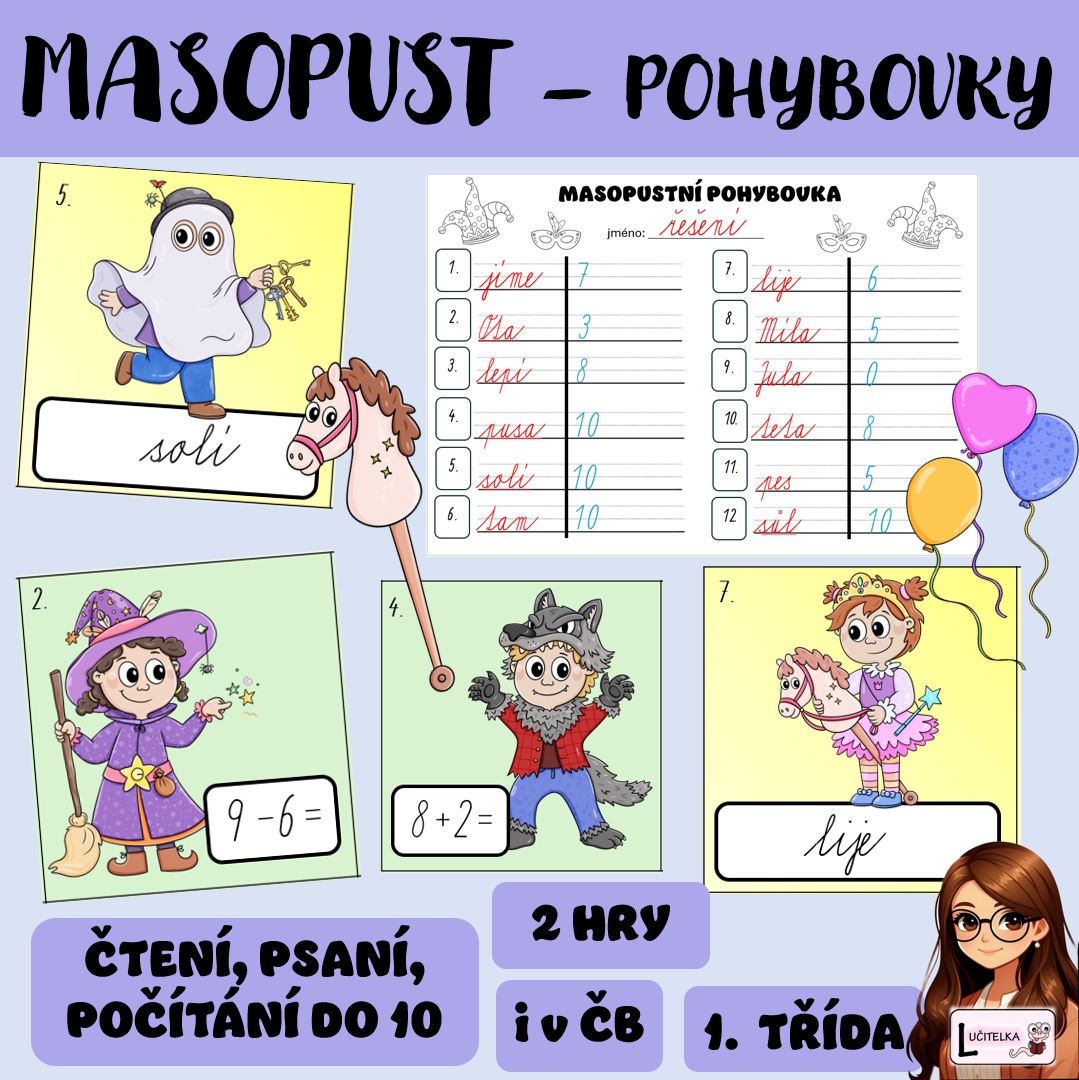 Cílem materiálu je procvičit si čtení, psaní a počítání do 10 formou pohybových her na téma masopust.