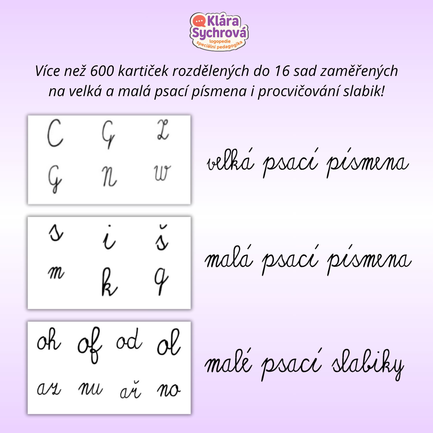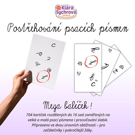 Mega balíček postřehovek – psací písmena a slabiky. Tento rozsáhlý soubor přináší 16 sad postřehových kartiček (celkem více než 600 kartiček), které procvičují psací písmena i slabiky hravou formou. Princip hry je jednoduchý – každé dvě karty mají vždy jeden společný symbol, který je potřeba co nejrychleji najít.