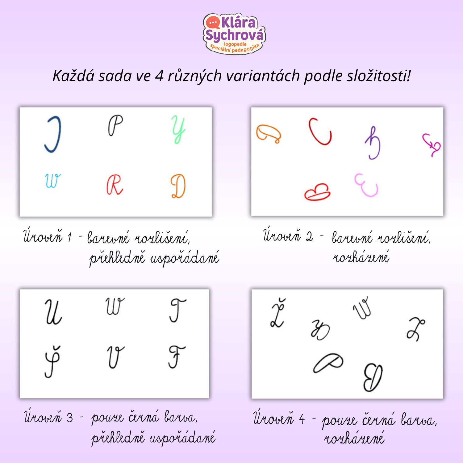Materiál je ideální nejen pro školáky, kteří si potřebují upevnit a zafixovat podobu psacích písmen, ale i pro předškoláky, kteří zatím číst neumí – mohou jednoduše hledat dva stejné prvky podle tvaru.
