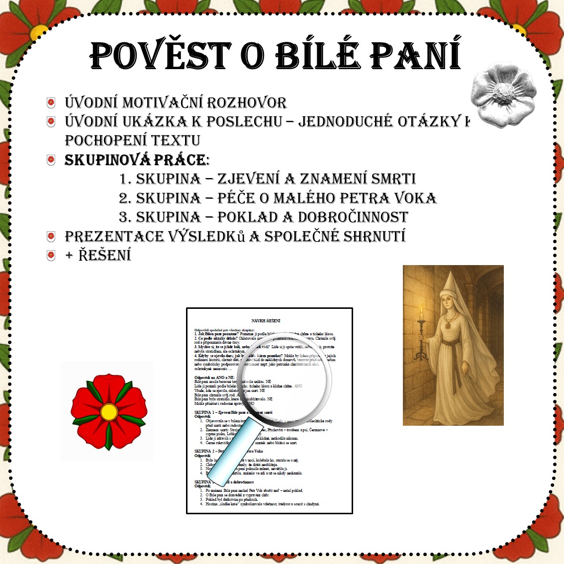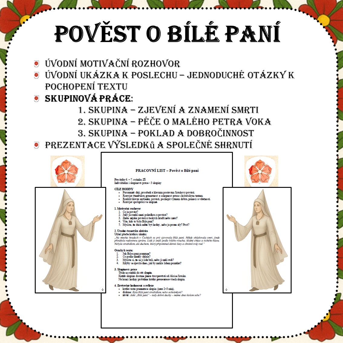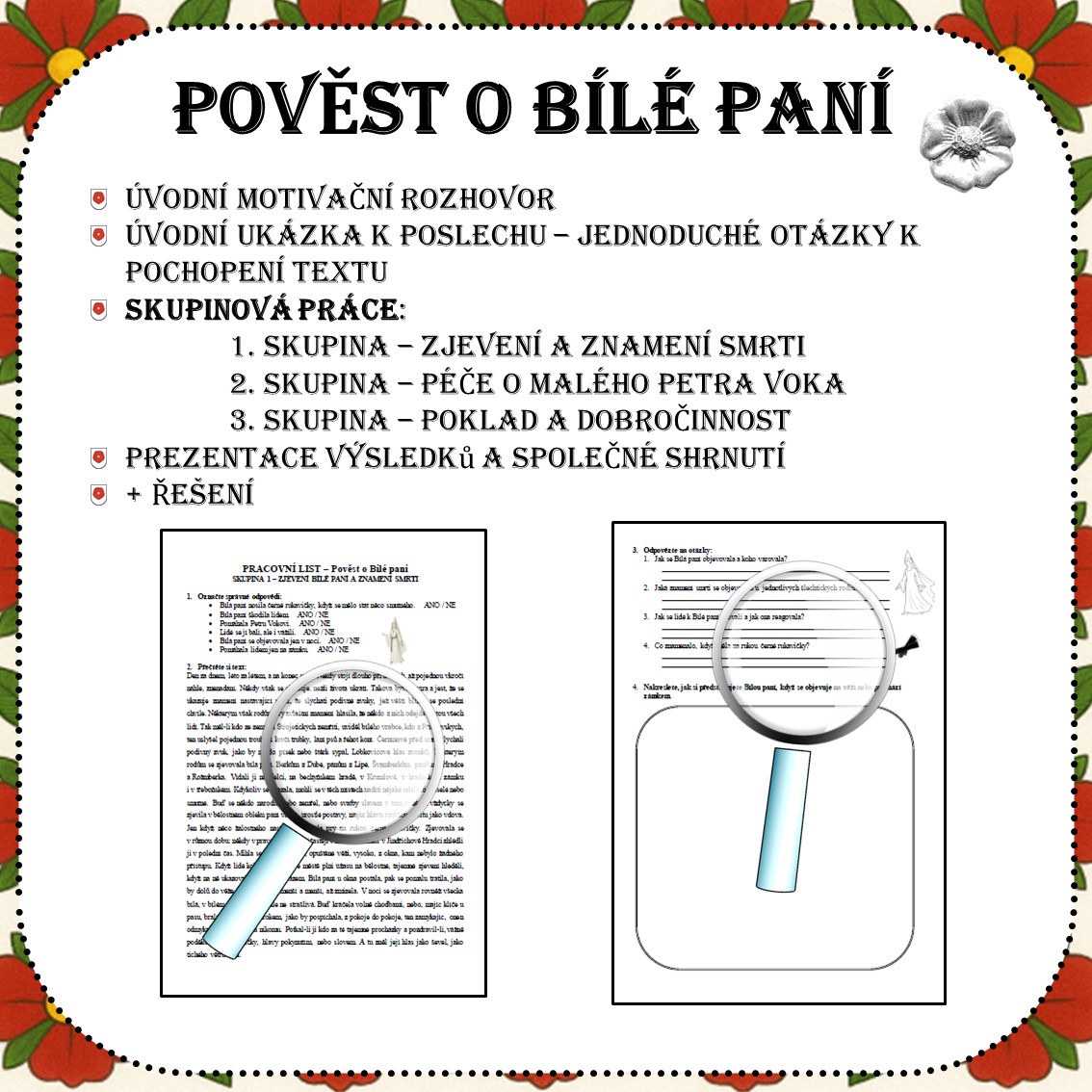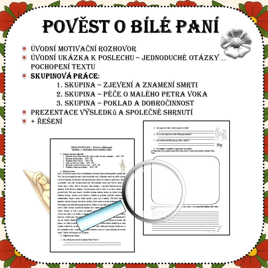 Materiál je zpracován na základě pověsti Bílá paní od Aloise Jiráska. Obsahuje úvodní motivační část, čtenářskou ukázku a tři pracovní listy, které žáci zpracovávají ve skupinách.