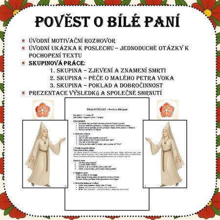 Materiál obsahuje úvodní motivační část, čtenářskou ukázku a tři pracovní listy podle částí textu, které žáci zpracovávají ve skupinách. Žáci se zamýšlejí nad postavou Bílé paní, významem jejího zjevení a nad hodnotami, které reprezentuje.